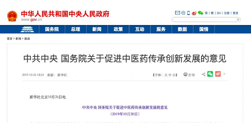 10月26日晚,國務(wù)院發(fā)布了《中共中央國務(wù)院關(guān)于促進(jìn)中醫(yī)藥傳承創(chuàng)新發(fā)展的意見》(以下簡稱《意見》)。