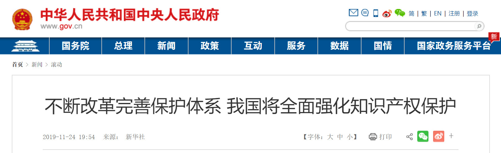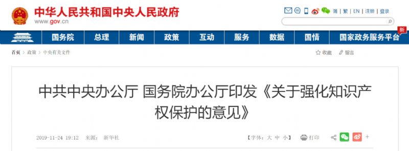 新華社北京11月24日電 近日,中共中央辦公廳、國(guó)務(wù)院辦公廳印發(fā)了《關(guān)于強(qiáng)化知識(shí)產(chǎn)權(quán)保護(hù)的意見(jiàn)》,并發(fā)出通知,要求各地區(qū)各部門結(jié)合實(shí)際認(rèn)真貫徹落實(shí)。