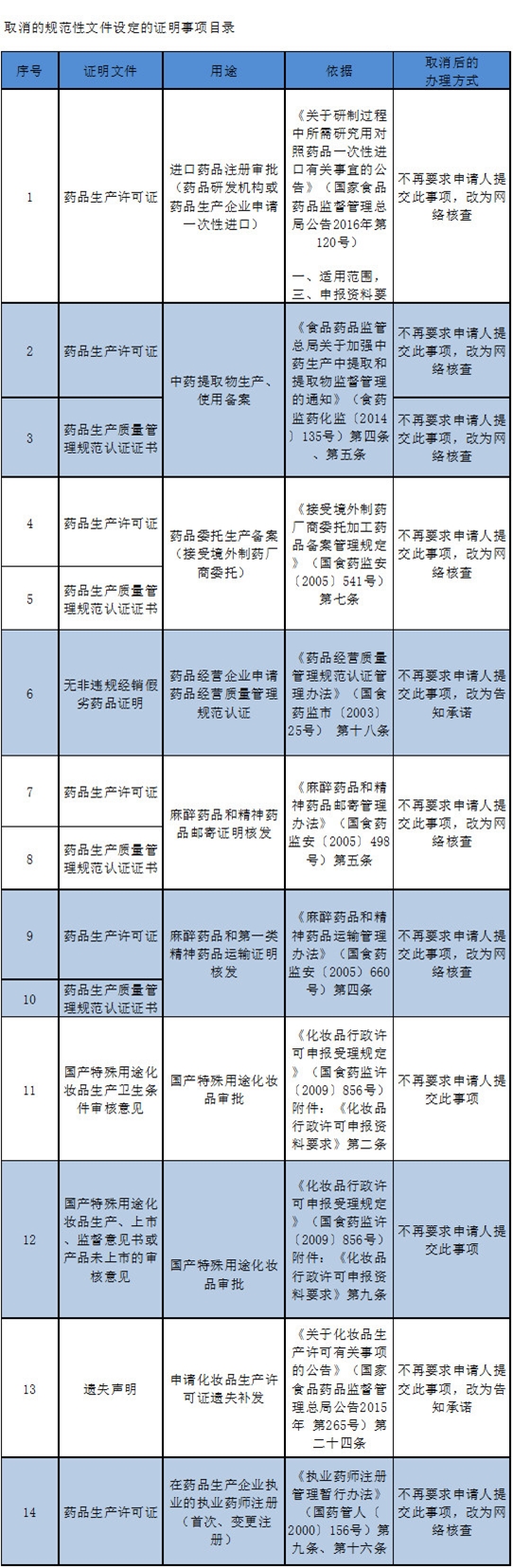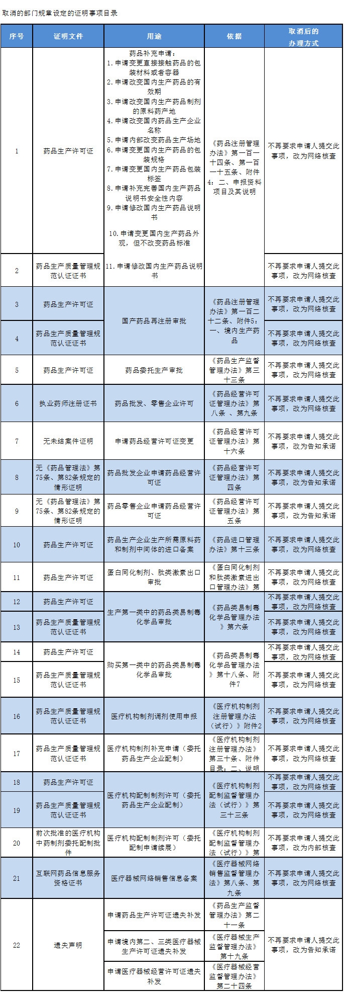 36項(xiàng)證明事項(xiàng)包括14項(xiàng)“規(guī)范性文件設(shè)定的證明事項(xiàng)”和24項(xiàng)“部門(mén)規(guī)章設(shè)定的證明事項(xiàng)”。很多事項(xiàng),不再要求申請(qǐng)人提交此,改為網(wǎng)絡(luò)核查。涉及到藥品生產(chǎn)許可證、執(zhí)業(yè)藥師注冊(cè)證書(shū)等諸多方面。