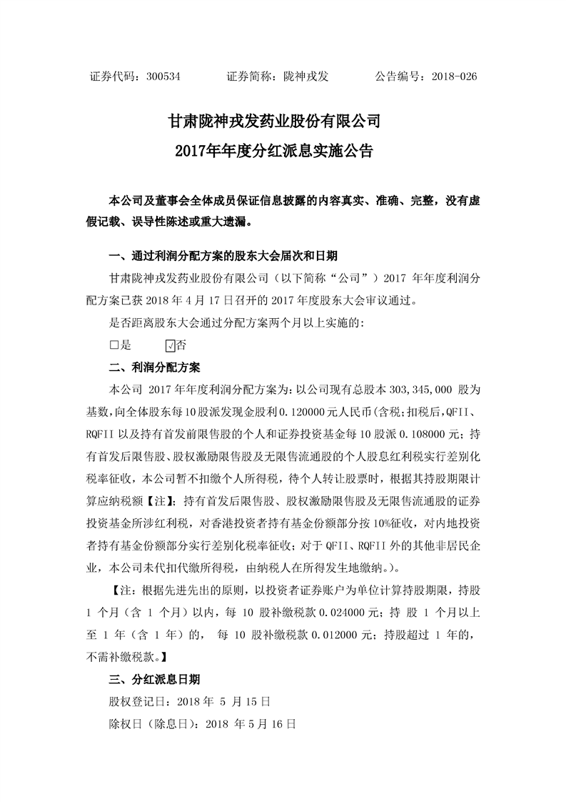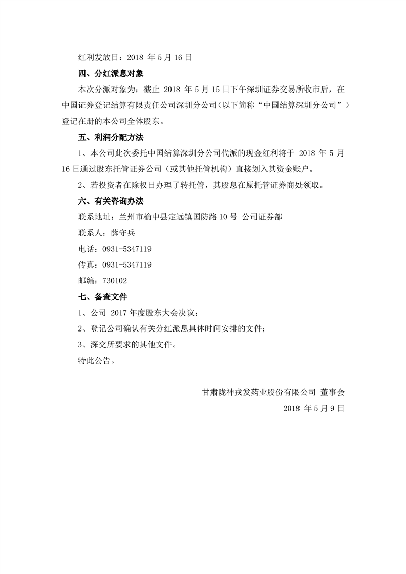 2017年年度分紅派息實施公告