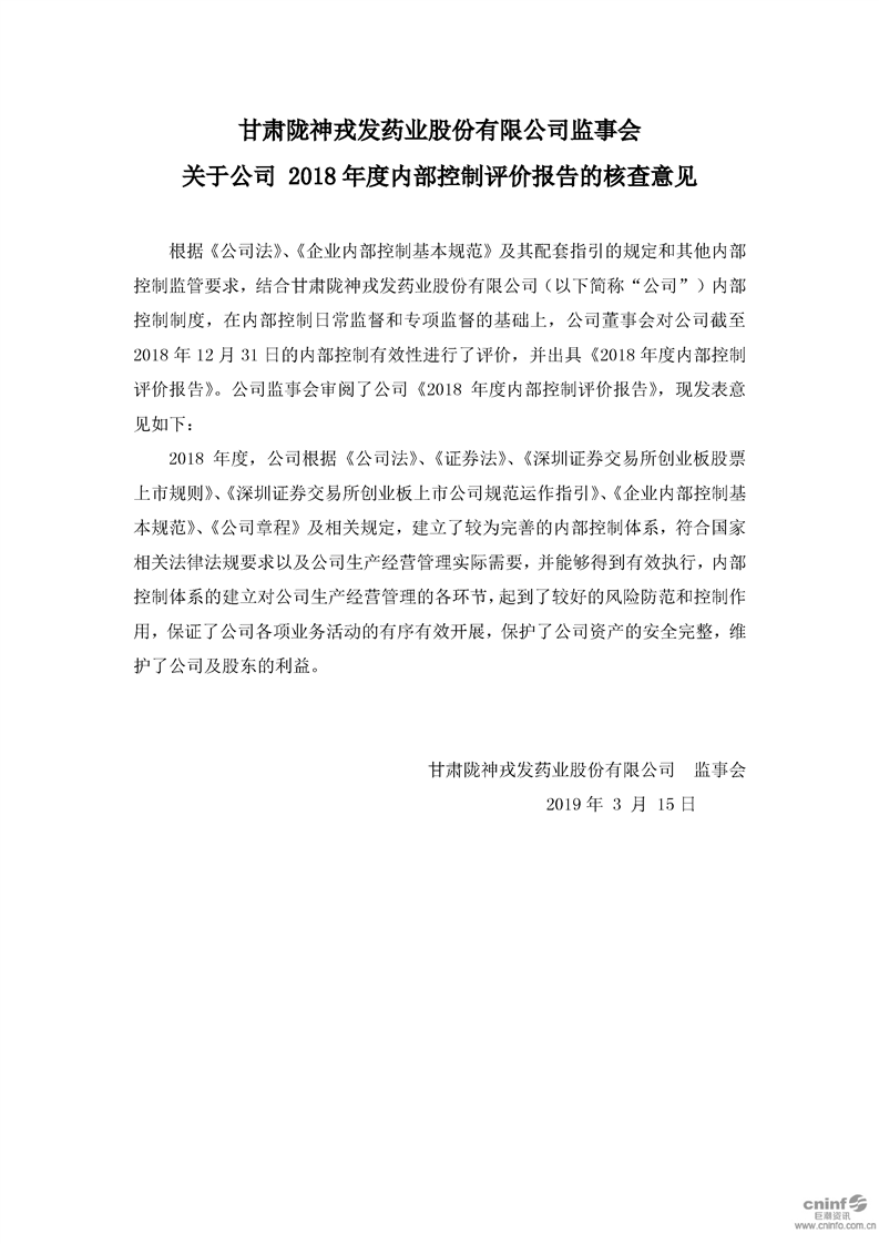監(jiān)事會 關于公司 2018 年度內部控制評價報告的核查意見