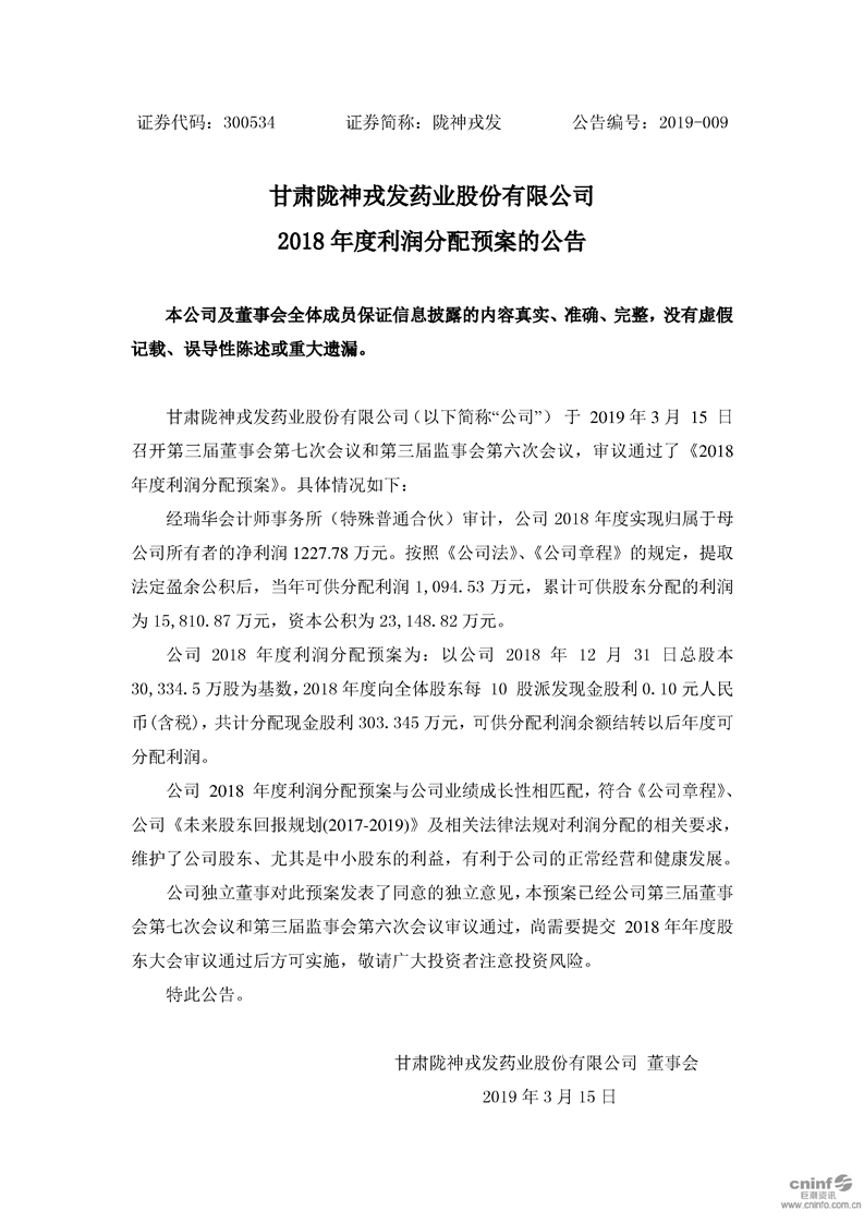 2018 年度利潤(rùn)分配預(yù)案的公告