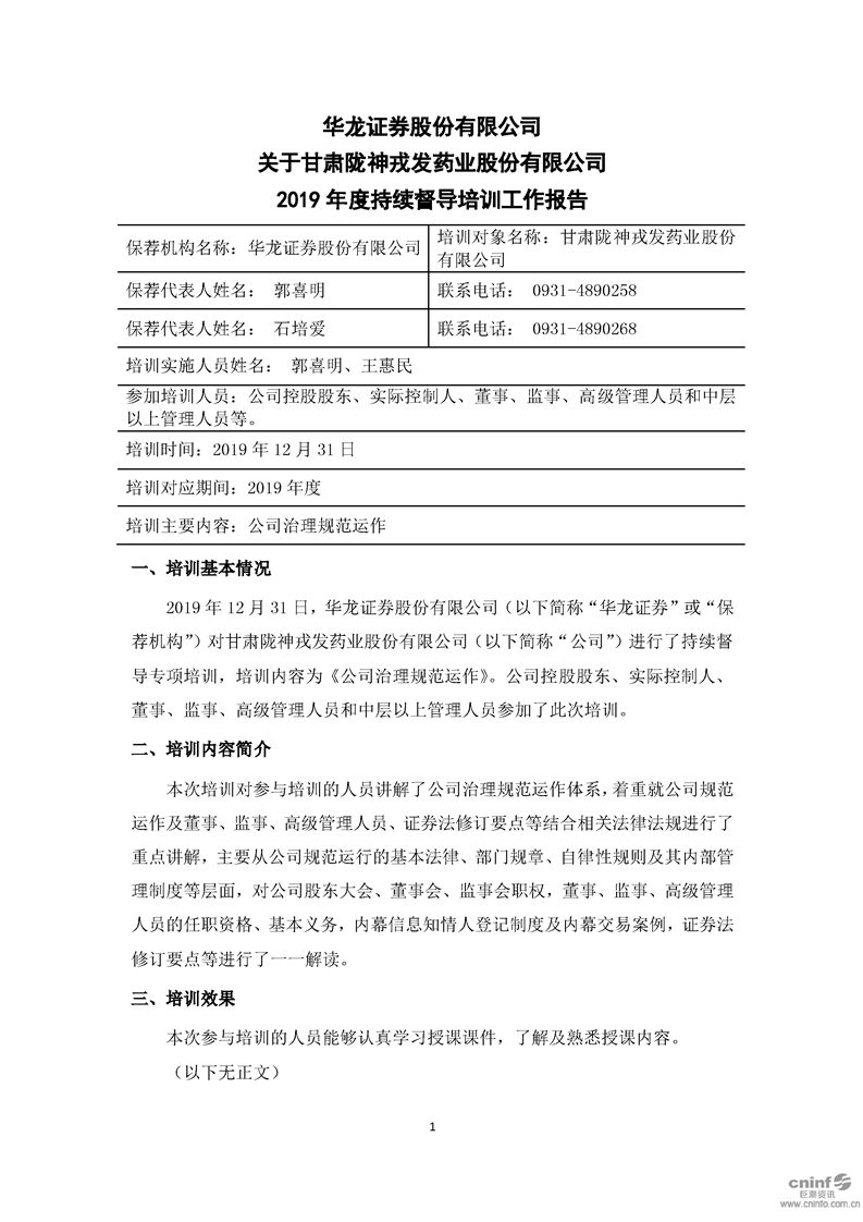 華龍證券股份有限公司關(guān)于公司2019年度持續(xù)督導(dǎo)培訓(xùn)工作報告