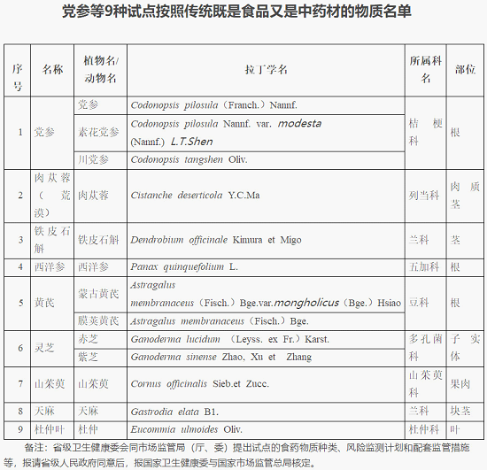 關于對黨參等9種物質(zhì)開展按照傳統(tǒng)既是食品又是中藥材的物質(zhì)管理試點工作的通知