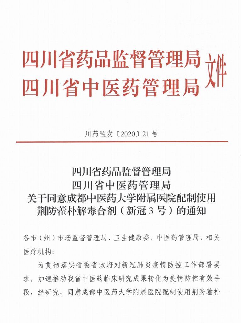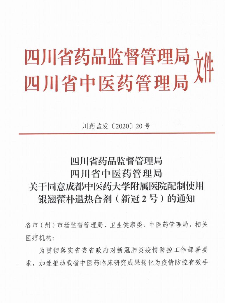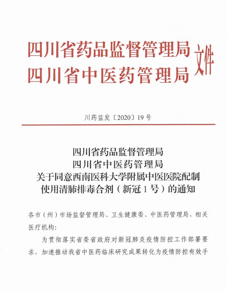 2月12日,四川省藥品監(jiān)督管理局、四川省中醫(yī)藥管理局聯(lián)合印發(fā)通知,疫情期間,同意西南醫(yī)科大學(xué)附屬中醫(yī)醫(yī)院申報(bào)的“清肺排毒合劑(新冠1號)”和成都中醫(yī)藥大學(xué)附屬醫(yī)院(四川省中醫(yī)院)申報(bào)的“銀翹藿樸退熱合劑(新冠2號)”、“荊防藿樸解毒合劑(新冠3號)”,在全省205家新型冠狀病毒感染的肺炎定點(diǎn)救治醫(yī)院直接調(diào)劑使用,無需向省藥品監(jiān)督管理局提出調(diào)劑申請;非四川省定點(diǎn)醫(yī)院申請調(diào)劑使用的,省藥品監(jiān)督管理局予以快速審批。
