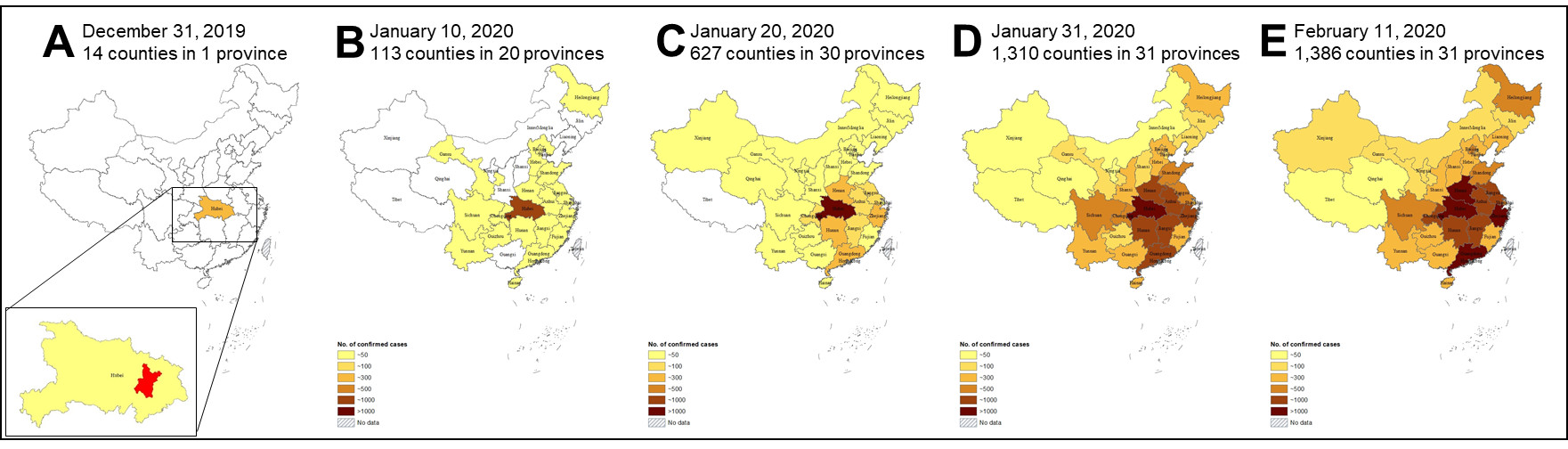 通過對報告病例的發(fā)病日期進(jìn)行回顧性分析,還原了新冠肺炎確診病例在五個不同時段全國地理分布變化情況。截至2月11日,全國31個省份的1386個縣區(qū)共報告44672例確診病例(湖北占74.7%,圖2 E),其中,有0.2%的病例發(fā)病日期在2019年12月31日之前,病例均在湖北(圖2 A);有1.7%的病例發(fā)病日期在1月10日之前,分布在20個省份的113個縣區(qū),其中湖北占88.5%(圖2 B);有13.8%的病例發(fā)病日期在1月20日之前,分布在30個省份的627個縣區(qū),其中湖北占77.6%(圖2 C);有73.1%的病例發(fā)病日期在1月31日之前,分布在31個省份的1,310個縣區(qū),其中湖北占74.7%(圖2 D)。
