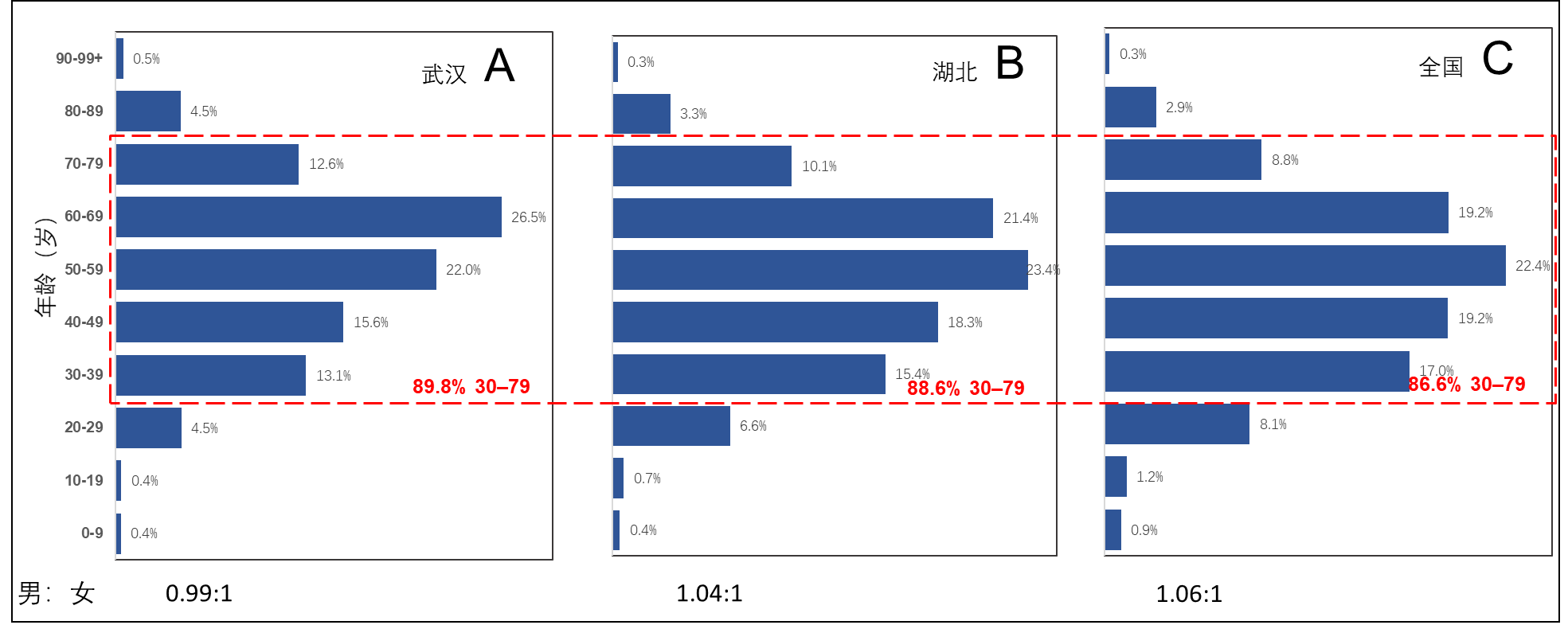 對確診病例(N = 44672)的特征進(jìn)行分析發(fā)現(xiàn),病人集中在30-79歲,該年齡組占確診病例總數(shù)比例武漢市為89.8%,湖北省(包括武漢)為88.6%,全國(包括湖北)為86.6%。60歲以上的老年組病例數(shù)占比,武漢為44.1%,湖北(包括武漢)為35.1%,全國(包括湖北)為31.2%(圖3)。確診病例男女比例武漢為0.99:1,湖北為1.04:1,全國為1.06:1,農(nóng)民或工人占22.0%,湖北省占74.7%,81.0%屬于輕/中癥(表1)。