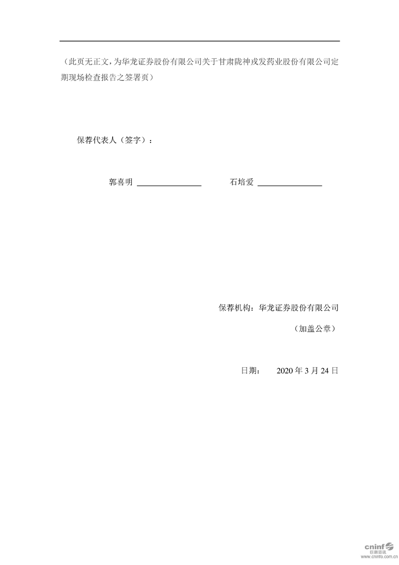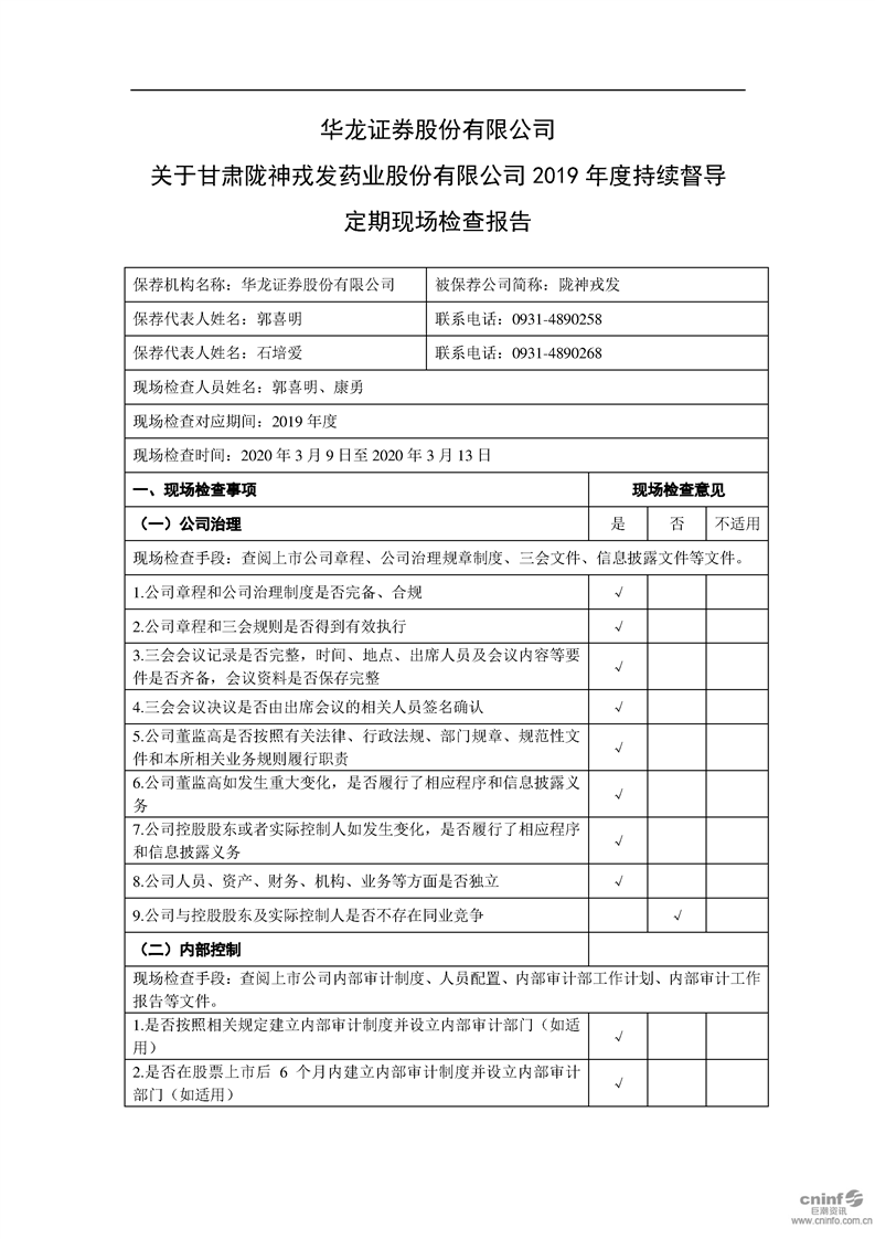 華龍證券股份有限公司關(guān)于公司2019年度持續(xù)督導(dǎo)定期現(xiàn)場(chǎng)檢查報(bào)告