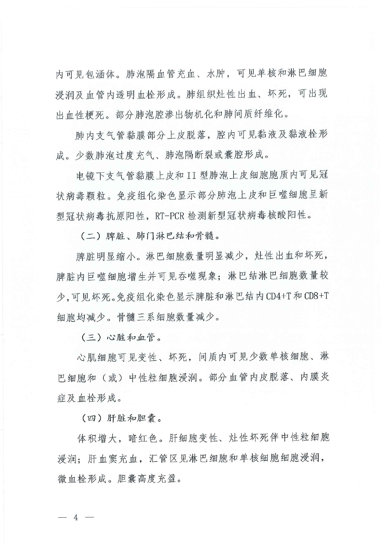 按照大體觀、鏡下觀分別對“肺臟、脾臟及肺門淋巴結(jié)、心臟和血管、肝臟和膽囊、腎臟、腦組織、腎上腺、食管、胃和腸管等器官”進(jìn)行描述。以肺臟和免疫系統(tǒng)損害為主。其他臟器因基礎(chǔ)病不同而不同,多為繼發(fā)性損害。