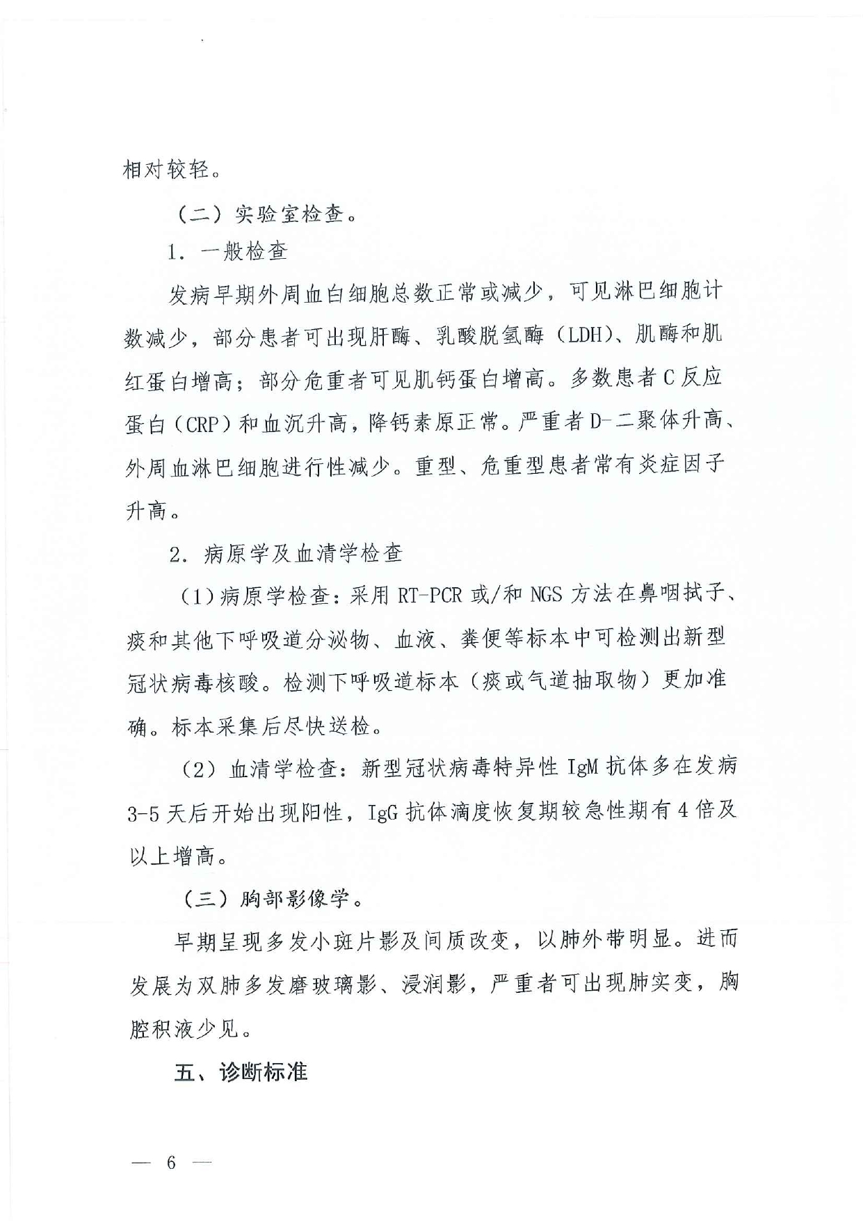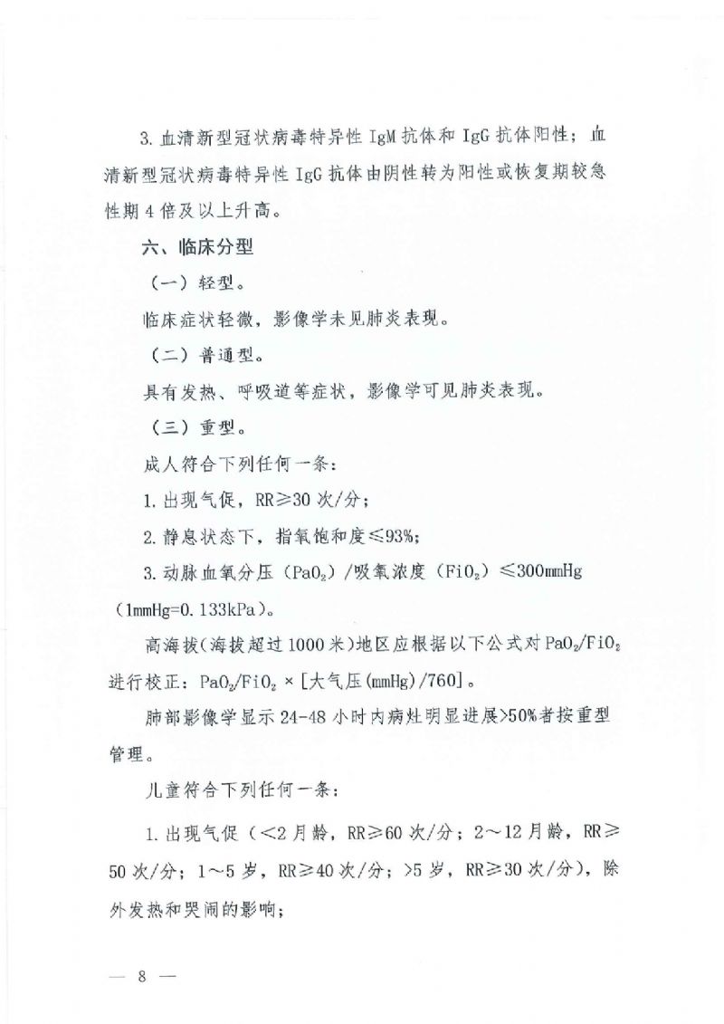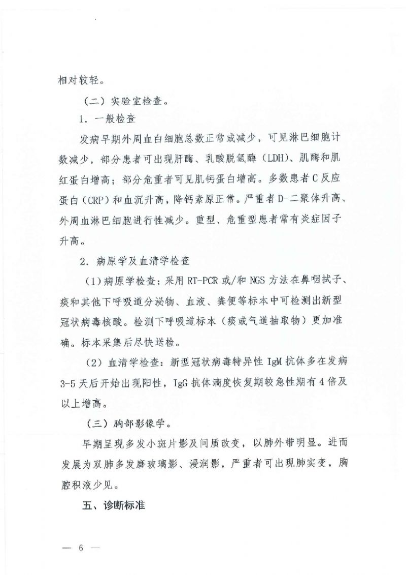 (三)確診病例在原有核酸檢測和測序基礎(chǔ)上增加“血清學(xué)檢測”作為依據(jù),即“新型冠狀病毒特異性IgM抗體和IgG陽性”或“新型冠狀病毒特異性IgG抗體由陰性轉(zhuǎn)為陽性或恢復(fù)期較急性期4倍及以上升高”也可確診。