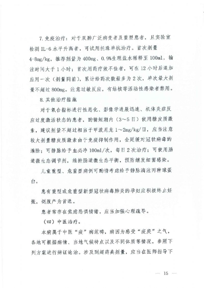 6.增加“托珠單抗”用于免疫治療:適應(yīng)證為“雙肺廣泛病變者及重型患者,且實(shí)驗(yàn)室檢測IL-6水平升高者”。給出了具體用法、用量,要注意過敏反應(yīng),有結(jié)核等活動性感染者禁用。