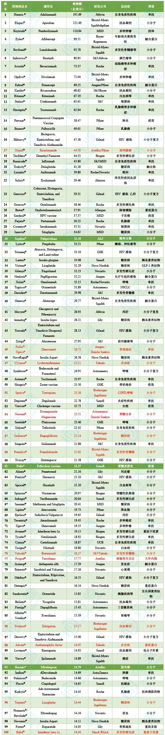 榜單中有三個(gè)藥物銷售額都超過(guò)了100億美元,這也是歷史首次,其中Keytruda®的年增長(zhǎng)率超過(guò)了50%,非常有望在未來(lái)幾年沖擊Humira®的寶座。TOP10的門(mén)檻已經(jīng)逼近70億美元大關(guān)。從適應(yīng)癥上來(lái)看,腫瘤、自身免疫疾病、糖尿病、心腦血管疾病、病毒感染等依然是暢銷藥頻出的領(lǐng)域。從藥物類型上看,分布更趨于平衡和多樣化,化學(xué)類藥物和生物類藥物幾乎各占一半,同時(shí)出現(xiàn)了一些新機(jī)制、新結(jié)構(gòu)、新類型的藥物,這也反映出只有不斷創(chuàng)新才能在藥物市場(chǎng)的競(jìng)爭(zhēng)中占據(jù)高地。從公司來(lái)看,榜單還是幾乎被歐美日制藥公司所壟斷,暢銷藥價(jià)值來(lái)源除了創(chuàng)新性還有藥物的推廣,包括擴(kuò)展新適應(yīng)癥和推向不同的地區(qū),在這兩個(gè)方面我國(guó)制藥公司和歐美巨頭還有不小的差距,但是隨著以恒瑞為代表的一大批創(chuàng)新性制藥公司的崛起,這個(gè)榜單應(yīng)該很快就能看到中國(guó)公司的名字。