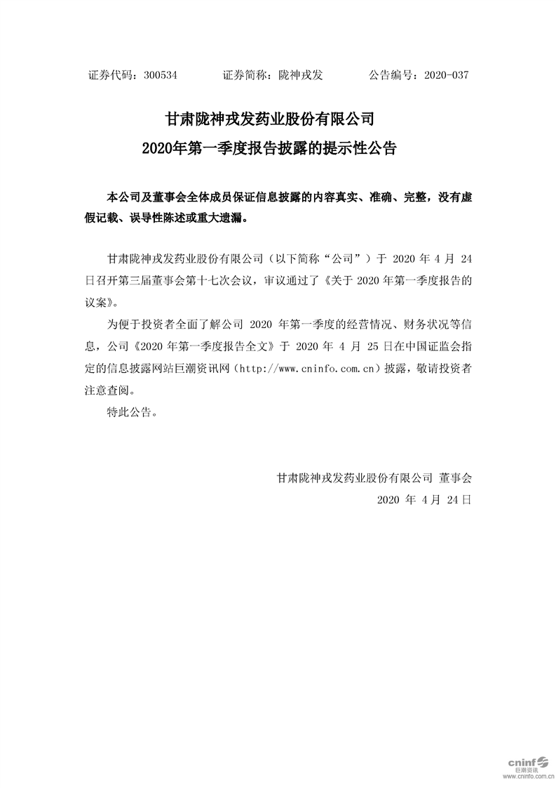 2020年第一季度報(bào)告披露的提示性公告