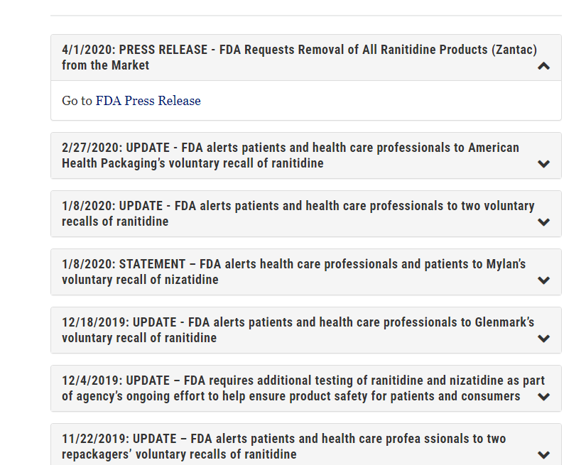 關(guān)于雷尼替丁中可能含有的致癌物,F(xiàn)DA 此前已經(jīng)發(fā)布了多次聲明。2019 年 9 月 13 日,F(xiàn)DA 在官網(wǎng)中第一次發(fā)布了提醒醫(yī)護(hù)人員/患者在雷尼替丁樣品中發(fā)現(xiàn)了 NDMA 的聲明。在當(dāng)時(shí)的聲明中,F(xiàn)DA 表示在幾個(gè)廠商的雷尼替丁藥品中發(fā)現(xiàn)了 N-亞硝基二甲基胺(NDMA),當(dāng)局正在評估正在評估雷尼替丁中低水平的 NDMA 是否對患者構(gòu)成風(fēng)險(xiǎn)。當(dāng)時(shí),F(xiàn)DA 沒有要求患者停止服用替尼替丁,但建議可以換用與雷尼替丁有相同作用的其他藥品。