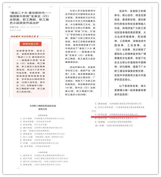 近日,由甘肅省總工會(huì)、省委宣傳部、省政府國資委于5月中旬主辦的“喜迎二十大 建功新時(shí)代 強(qiáng)國復(fù)興有我”全省企(行)業(yè)歌曲、職工舞蹈、職工曲藝小品征集展演、評(píng)選活動(dòng)結(jié)束,由甘肅藥業(yè)集團(tuán)選送的隴神戎發(fā)舞蹈《中華民族》喜獲職工舞蹈類入選作品獎(jiǎng)。