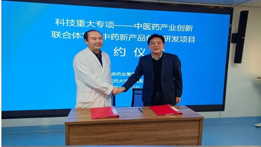 甘肅藥業(yè)集團(tuán)科技產(chǎn)業(yè)部部長(zhǎng)、甘肅藥業(yè)集團(tuán)科技創(chuàng)新研究院董事長(zhǎng)邱國(guó)玉與甘肅中醫(yī)藥大學(xué)附屬醫(yī)院院長(zhǎng)謝興文代表雙方簽署合作協(xié)議。