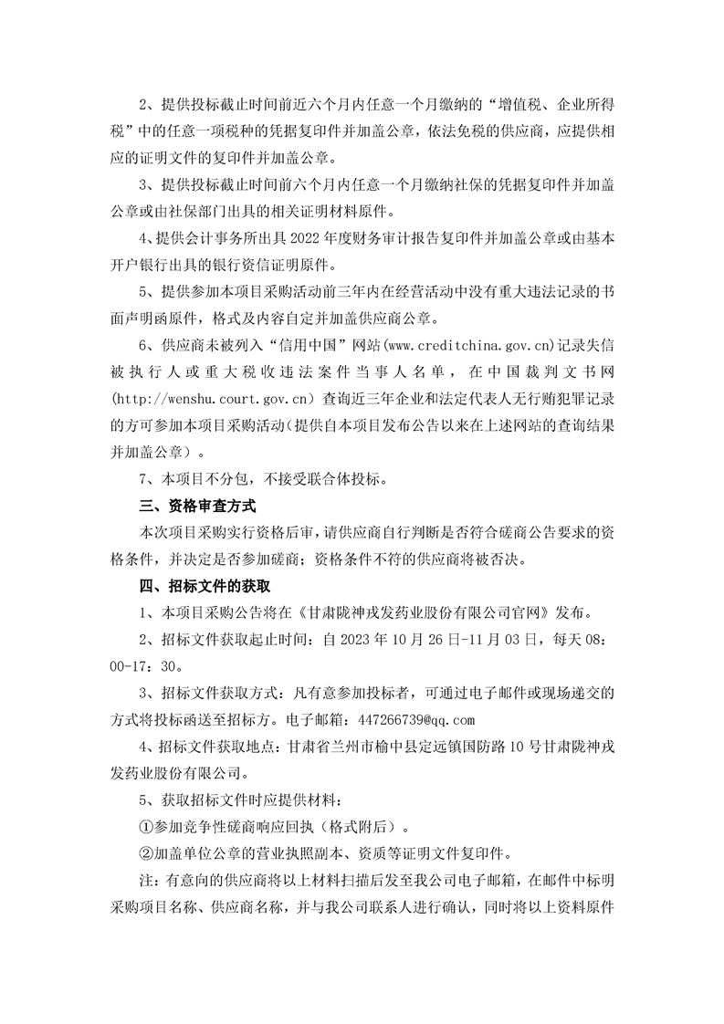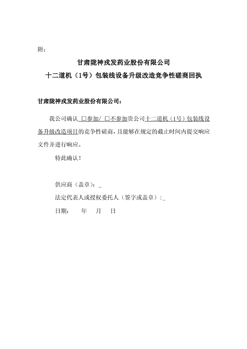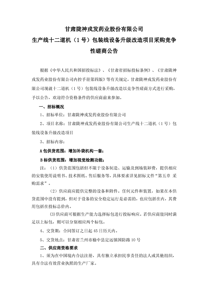 甘肅隴神戎發(fā)藥業(yè)股份有限公司生產(chǎn)線十二道機(jī)(1號(hào))包裝線設(shè)備升級(jí)改造項(xiàng)目采購(gòu)競(jìng)爭(zhēng)性磋商公告