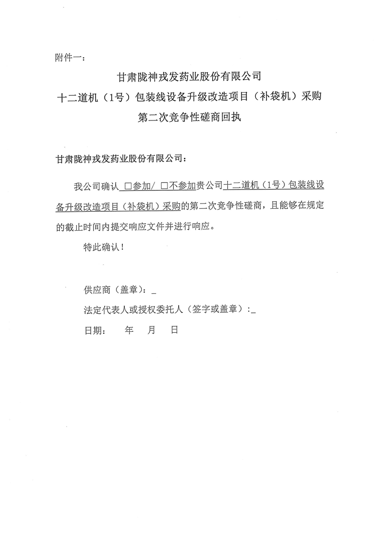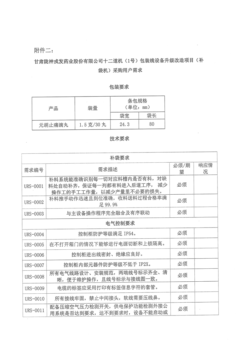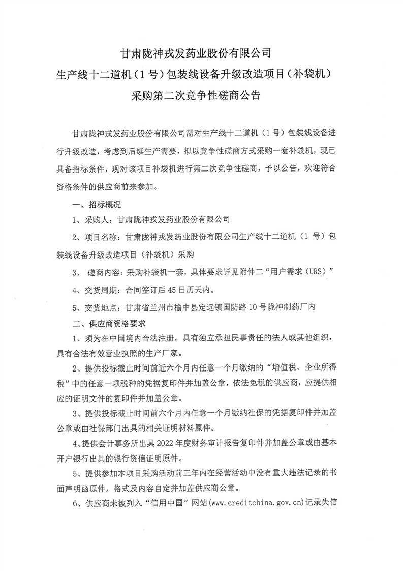 甘肅隴神戎發(fā)藥業(yè)股份有限公司生產(chǎn)線十二道機(jī)(1號(hào))包裝線設(shè)備升級(jí)改造項(xiàng)目(補(bǔ)袋機(jī))采購(gòu)第二次競(jìng)爭(zhēng)性磋商公告