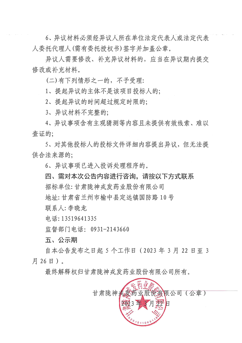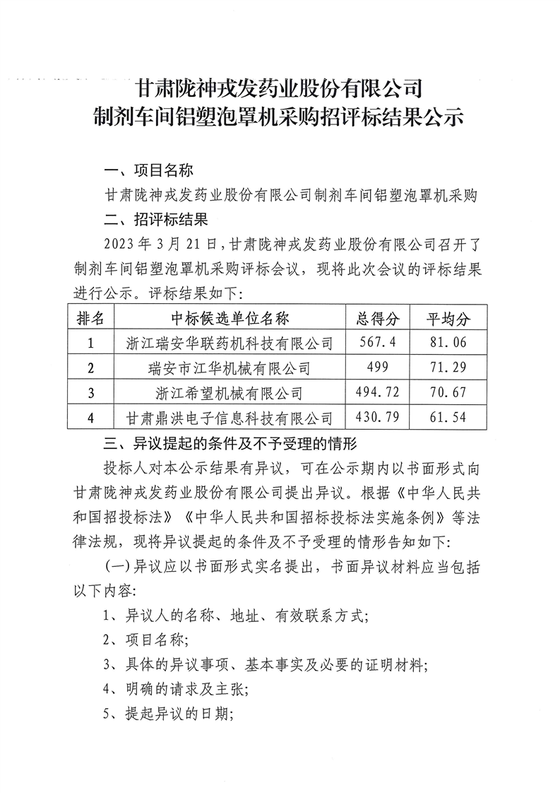 甘肅隴神戎發(fā)藥業(yè)股份有限公司制劑車間鋁塑泡罩機采購招評標結果公示