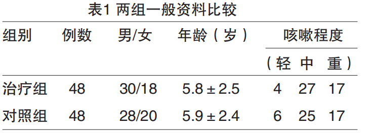 1.1一般資料 2010年3月-10月本院兒科門診及病房收治的呼吸道感染( 其中包括氣管支氣管炎輕型肺炎 )患兒96例,均符合《實用兒科學(xué)》( 第七版)診斷標準,伴有中度以上咳嗽、咳痰癥狀。全部病例采用隨機、對照、開放方法分為治療組與對照組各48例,兩組一般資料比較差異無統(tǒng)計學(xué)意義(P>0.05),具有可比性,見表1。
