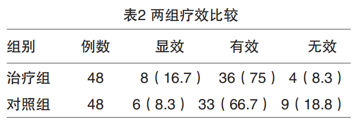 1.5統(tǒng)計學(xué)方法 使用SPSS13.0軟件對所有數(shù)據(jù)進行統(tǒng)計學(xué)處理,率的比較采用卡方檢驗,綜合療效用軼和檢驗進行統(tǒng)計學(xué)處理。
