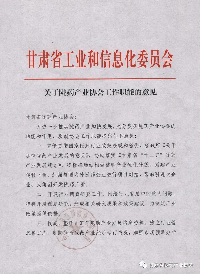 為了加快我省中藥材資源優(yōu)勢向經(jīng)濟優(yōu)勢轉(zhuǎn)化,培育壯大隴藥產(chǎn)業(yè),貫徹國務(wù)院辦公廳《關(guān)于進一步支持甘肅經(jīng)濟社會發(fā)展的若干意見》(國辦【2010】129號)精神,省委省政府于2010年7月制定頒發(fā)了《關(guān)于加快隴藥產(chǎn)業(yè)發(fā)展的意見》,成立了推進隴藥產(chǎn)業(yè)發(fā)展協(xié)調(diào)領(lǐng)導(dǎo)小組,科學(xué)布局,主打“隴”字招牌。在甘肅省工信委隴藥辦的主持下,由甘肅奇正實業(yè)集團有限公司、蘭州生物制品研究所、蘭州佛慈制藥股份有限公司、蘭州大得利生化制藥(廠)有限公司及國藥控股甘肅有限公司為發(fā)起,67家甘肅醫(yī)藥企業(yè)加盟,歷時一年籌備,甘肅省隴藥產(chǎn)業(yè)協(xié)會正式成立。