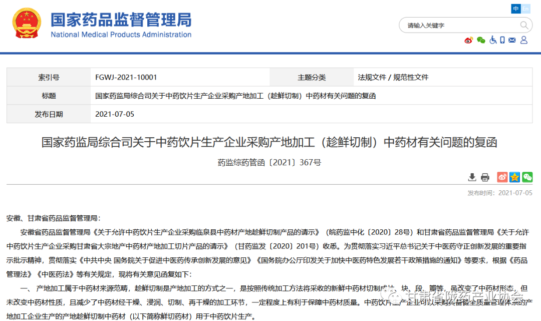 2021年6月,國家藥監(jiān)局印發(fā)《關(guān)于中藥飲片生產(chǎn)企業(yè)采購產(chǎn)地加工(趁鮮切制)中藥材有關(guān)問題的復(fù)函》(藥監(jiān)綜藥管函【2021】367號),允許全國中藥飲片生產(chǎn)企業(yè)可以采購甘肅省全省和安徽省臨泉縣一個縣、符合條件的產(chǎn)地加工企業(yè)生產(chǎn)的產(chǎn)地趁鮮切制中藥材,用于中藥飲片生產(chǎn),為甘肅中藥材產(chǎn)地加工高質(zhì)量發(fā)展帶來重大政策支撐。省藥監(jiān)局等10廳局聯(lián)合印發(fā)《甘肅省大宗地產(chǎn)中藥材產(chǎn)地加工(趁鮮切制)工作方案》(甘藥監(jiān)發(fā)【2021】149號),公布了黃芪、黨參、當歸、甘草、大黃、板藍根、紅芪首批7個試點品種。隴藥協(xié)會搶抓這一政策機遇,組織相關(guān)企業(yè)制定遠高于現(xiàn)行《中國藥典》的行業(yè)標準,引進國際先進加工技術(shù),生產(chǎn)高品質(zhì)當歸、黃芪、黨參等大宗地產(chǎn)中藥材及飲片,引領(lǐng)帶動全省中藥材產(chǎn)地加工由傳統(tǒng)農(nóng)耕經(jīng)濟向標準化、工業(yè)化、數(shù)字化、全球化平臺經(jīng)濟轉(zhuǎn)型。