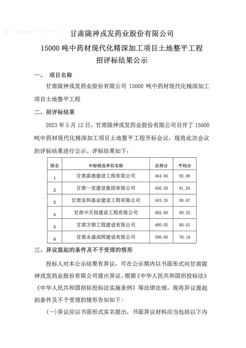 甘肅隴神戎發(fā)藥業(yè)股份有限公司15000噸中藥材現(xiàn)代化精深加工項目土地整平工程招評標結(jié)果公示