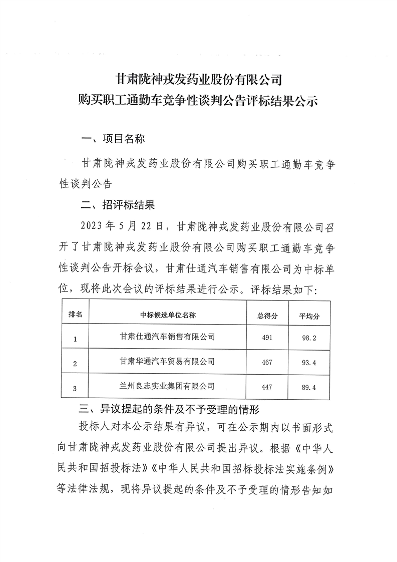 甘肅隴神戎發(fā)藥業(yè)股份有限公司購買職工通勤車競爭性談判公告評標結(jié)果公示