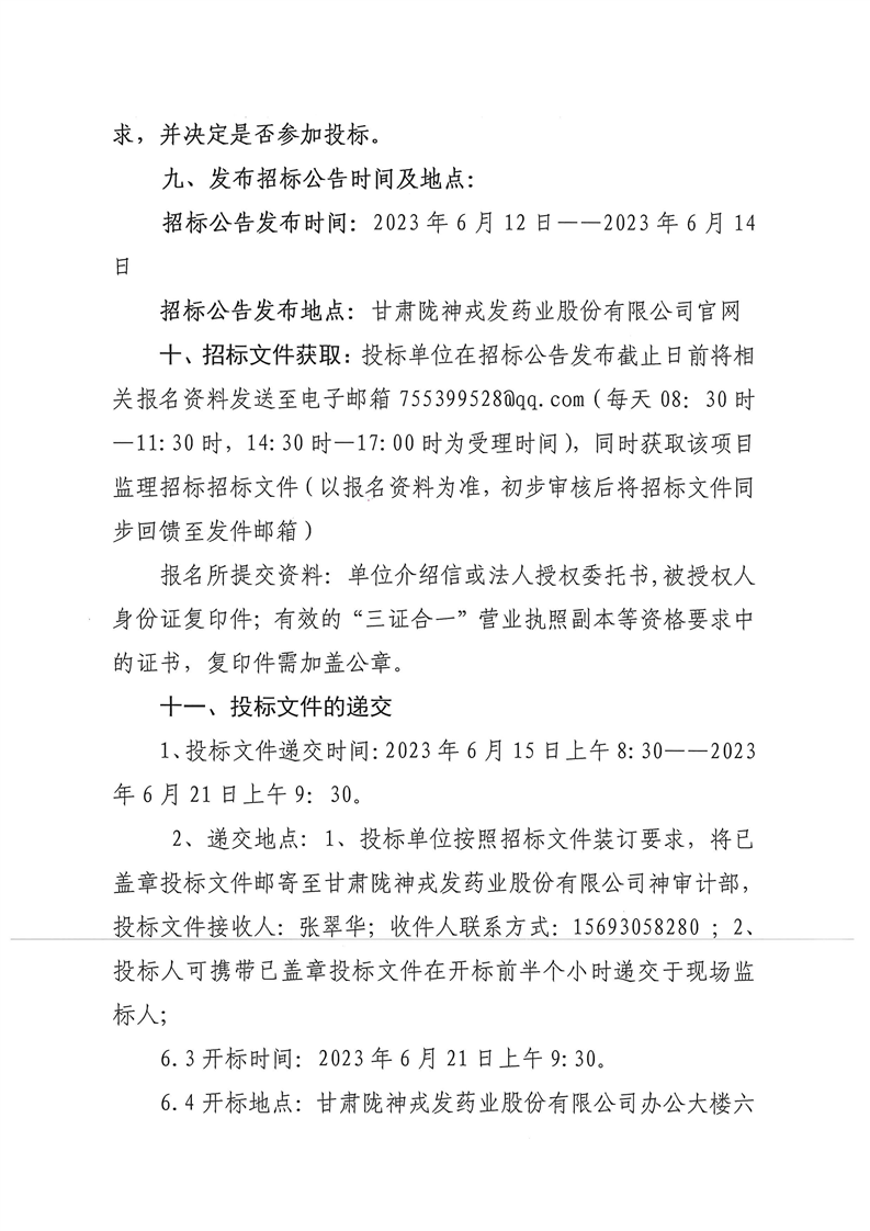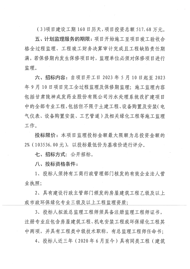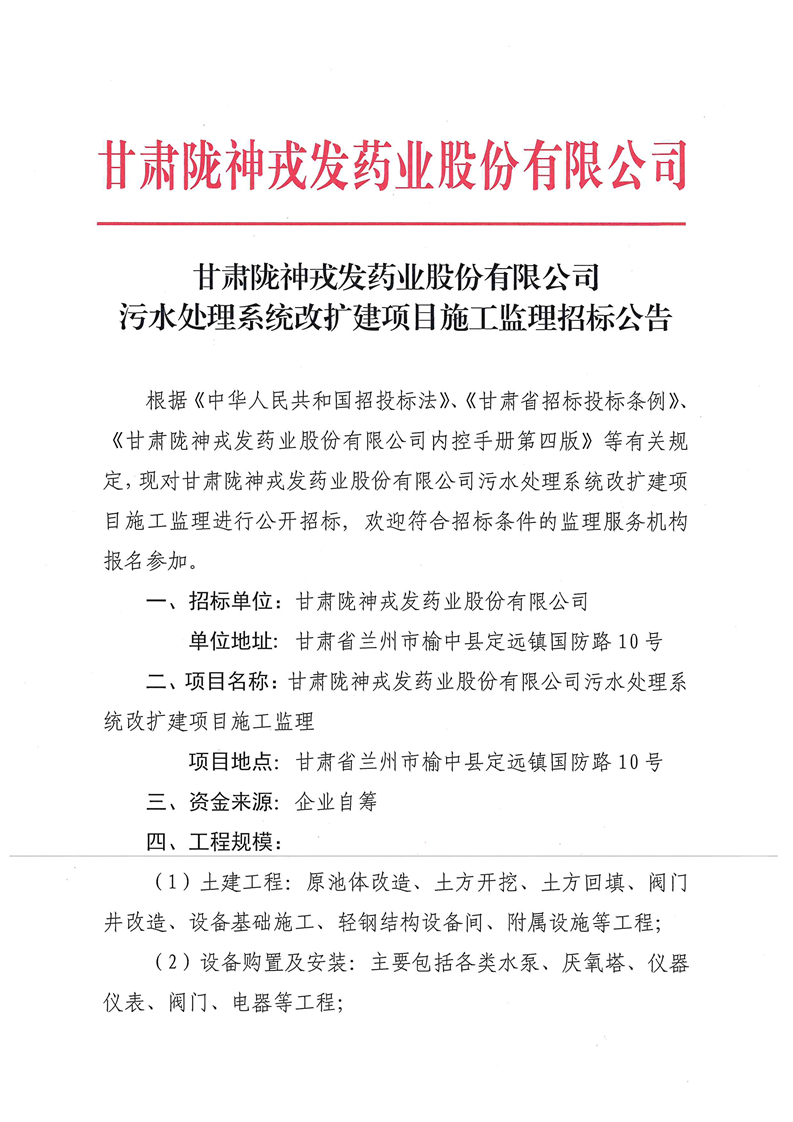 甘肅隴神戎發(fā)藥業(yè)股份有限公司污水處理系統(tǒng)改擴(kuò)建項(xiàng)目施工監(jiān)理招標(biāo)公告