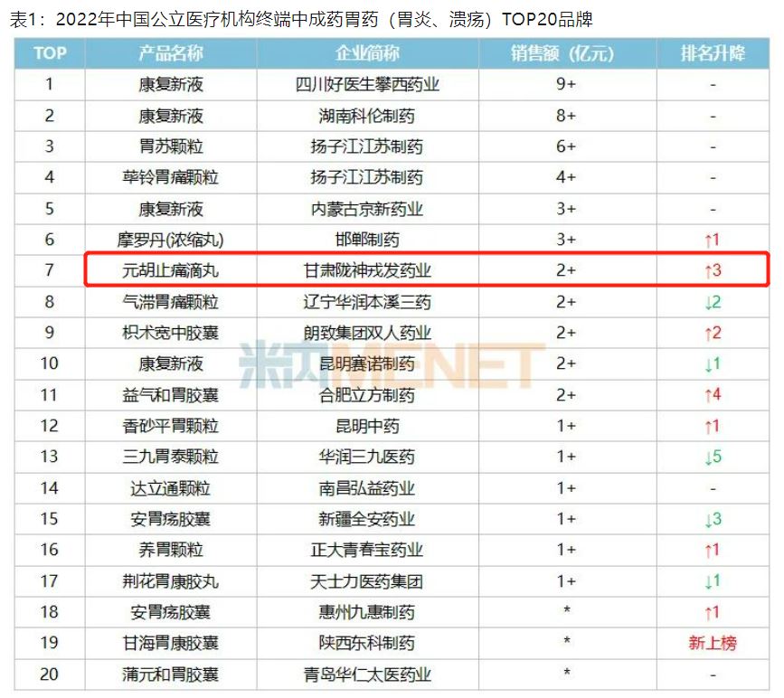 據(jù)統(tǒng)計,我國胃腸疾病患者有1.2億人,且發(fā)病率越來越高。據(jù)米內(nèi)網(wǎng)最新數(shù)據(jù)顯示,2022年中國公立醫(yī)療機(jī)構(gòu)終端中成藥胃藥(胃炎、潰瘍)銷售額保持在70億元水平。其中甘肅隴神戎發(fā)藥業(yè)的元胡止痛滴丸銷售額超過2億元,在2022年中國公立醫(yī)療機(jī)構(gòu)終端中成藥胃藥(胃炎、潰瘍)TOP品牌排名第七。