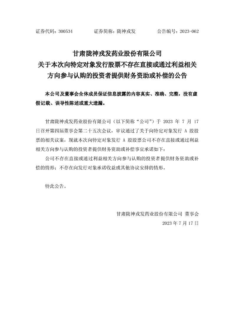 關(guān)于本次向特定對象發(fā)行股票不存在直接或通過利益相關(guān)方向參與認(rèn)購的投資者提供財務(wù)資助或補償?shù)墓?/h2>
