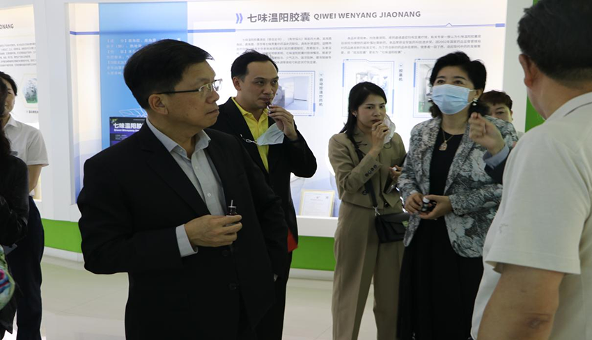 甘肅藥業(yè)投資集團有限公司黨委副書記、工會主席王賢斌,隴神戎發(fā)黨委委員、董事、副總經理兼董事會秘書元勤輝,副總經理、甘肅新絲路產業(yè)投資有限公司執(zhí)行董事兼總經理李偉及相關人員陪同參觀考察。 參觀人員一行首先來到公司產品展廳及生產車間參觀,了解甘肅藥業(yè)集團及隴神戎發(fā)歷史沿革、發(fā)展歷程。在產品展廳聽取了隴神戎發(fā)四個全國獨家品種:元胡止痛滴丸,鞣酸小檗堿膜、七味溫陽膠囊、酸棗仁油滴丸以及保健食品黃芪當歸膠囊和其他普藥產品的介紹,對所屬企業(yè)普安制藥生產的宣肺止嗽合劑在對抗新冠疫情中發(fā)揮的重要作用及治療新冠病毒感染咳嗽癥狀緩解率98.27%的研究成果進行了詳細介紹,并就該產品進入泰國市場的條件現場與泰國衛(wèi)生部傳統和替代醫(yī)學司進行了交流探討。參觀過程中,泰國衛(wèi)生部傳統和替代醫(yī)學司司長一行對公司產品以及產品生產流程、藥理藥學、自動化設備以及中醫(yī)理論等表現出極大的興趣,現場飲用宣肺止嗽合劑,并對公司現代化先進生產設備及GMP管理給予高度評價。