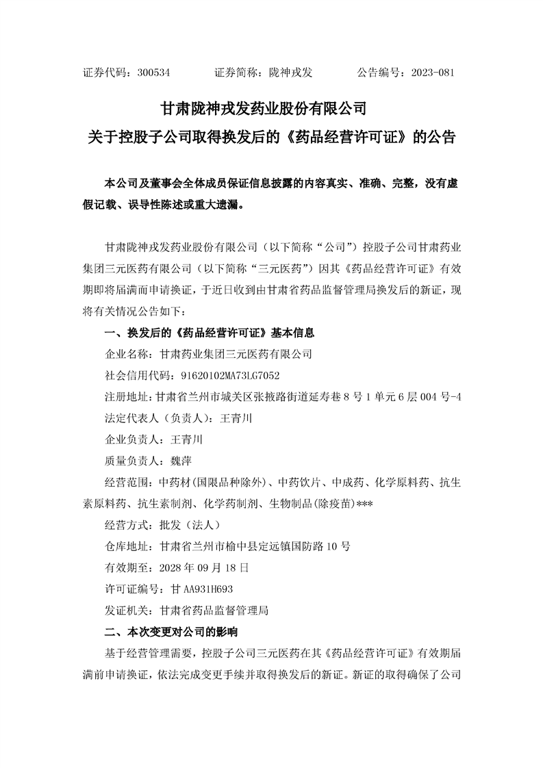 關(guān)于控股子公司取得換發(fā)后的《藥品經(jīng)營(yíng)許可證》的公告