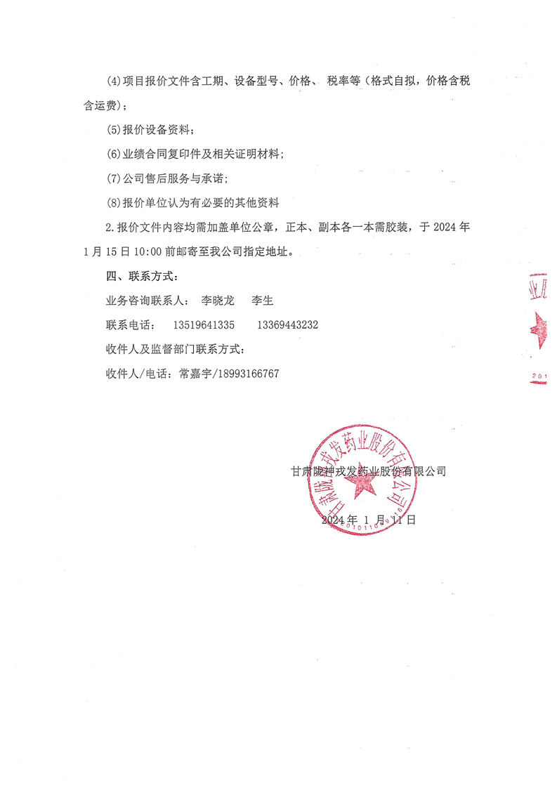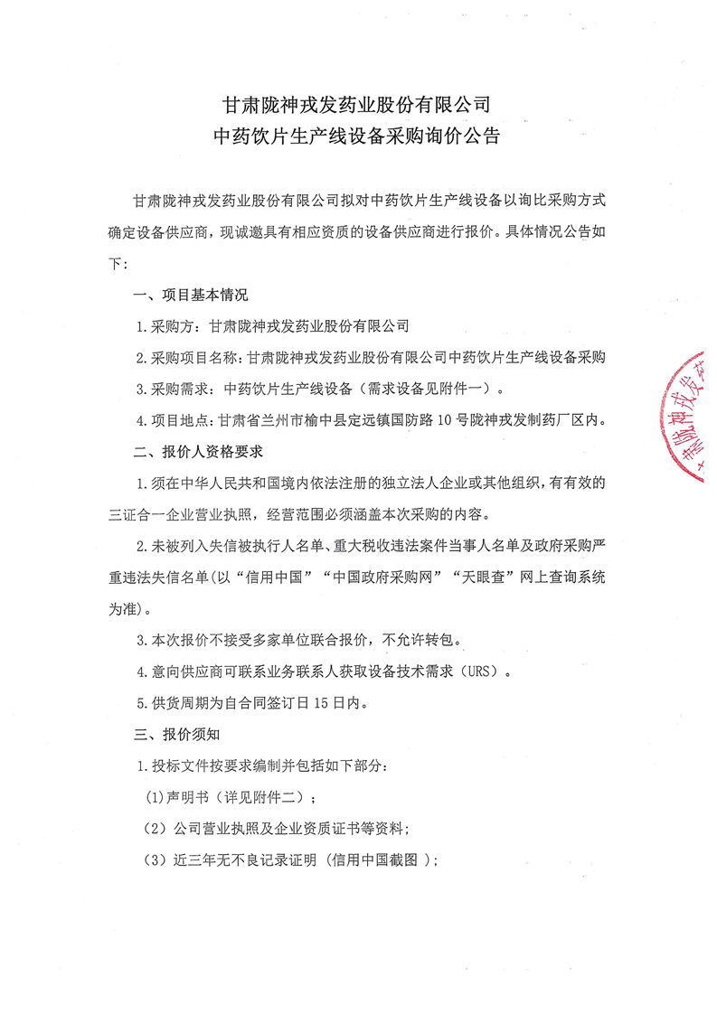 甘肅隴神戎發(fā)藥業(yè)股份有限公司中藥飲片生產(chǎn)線設備采購詢價公告