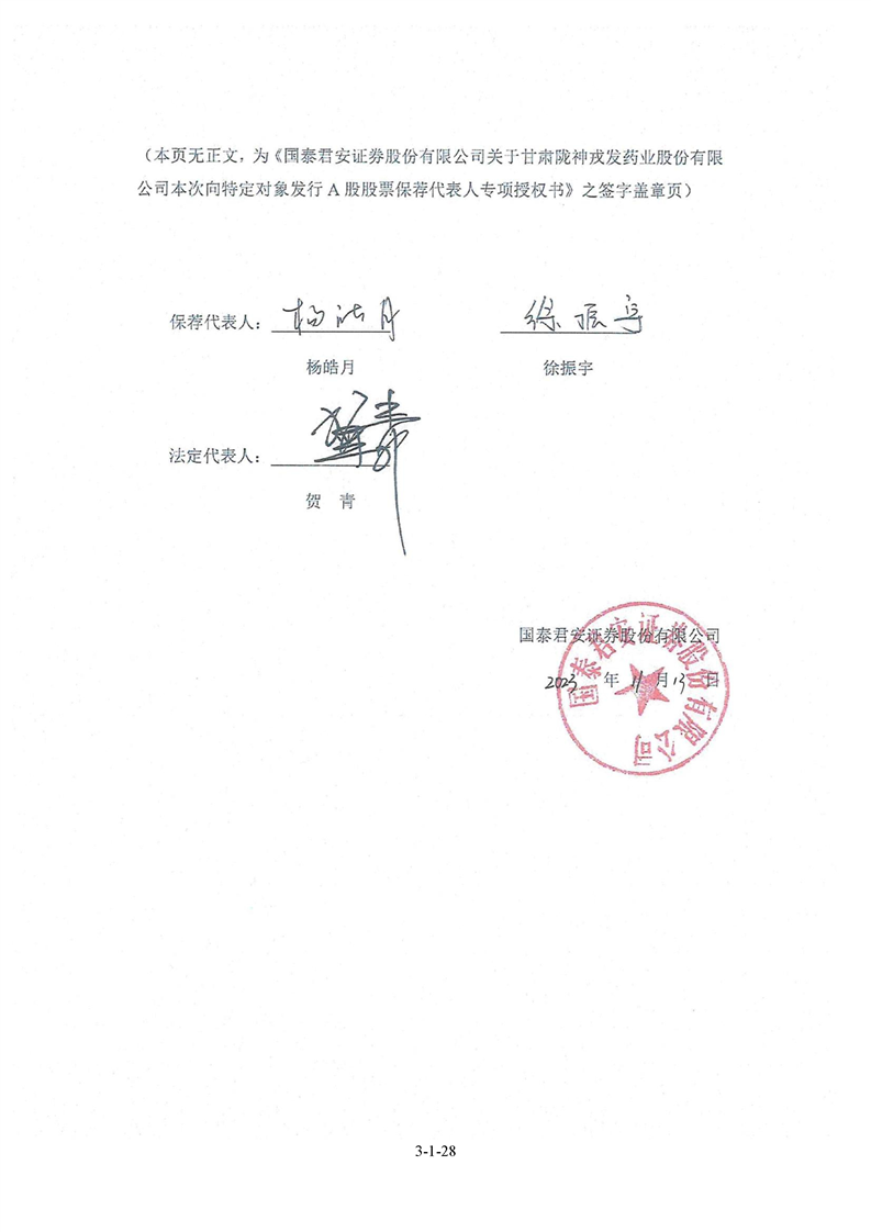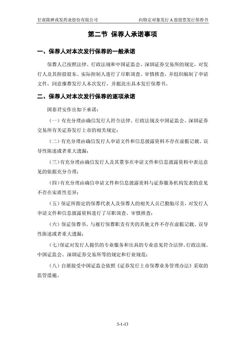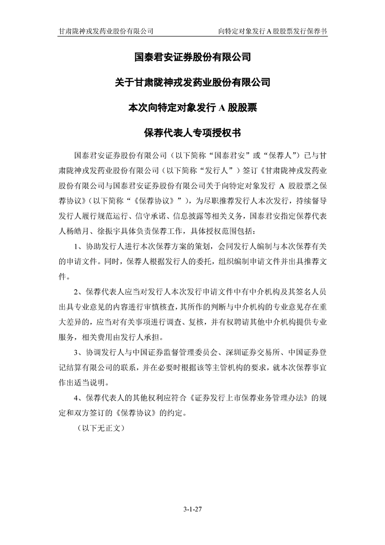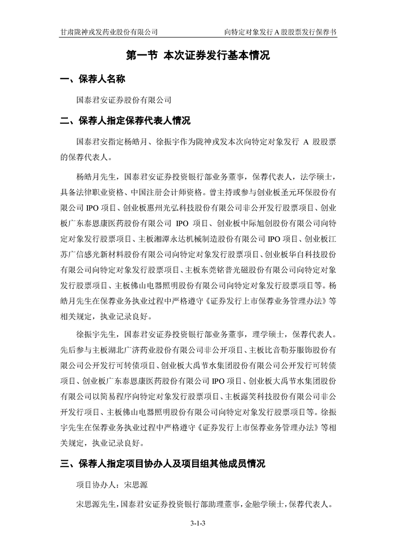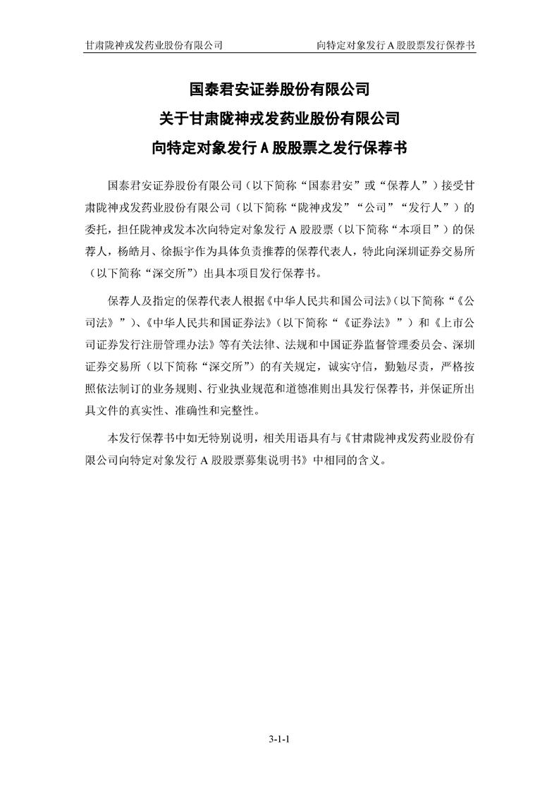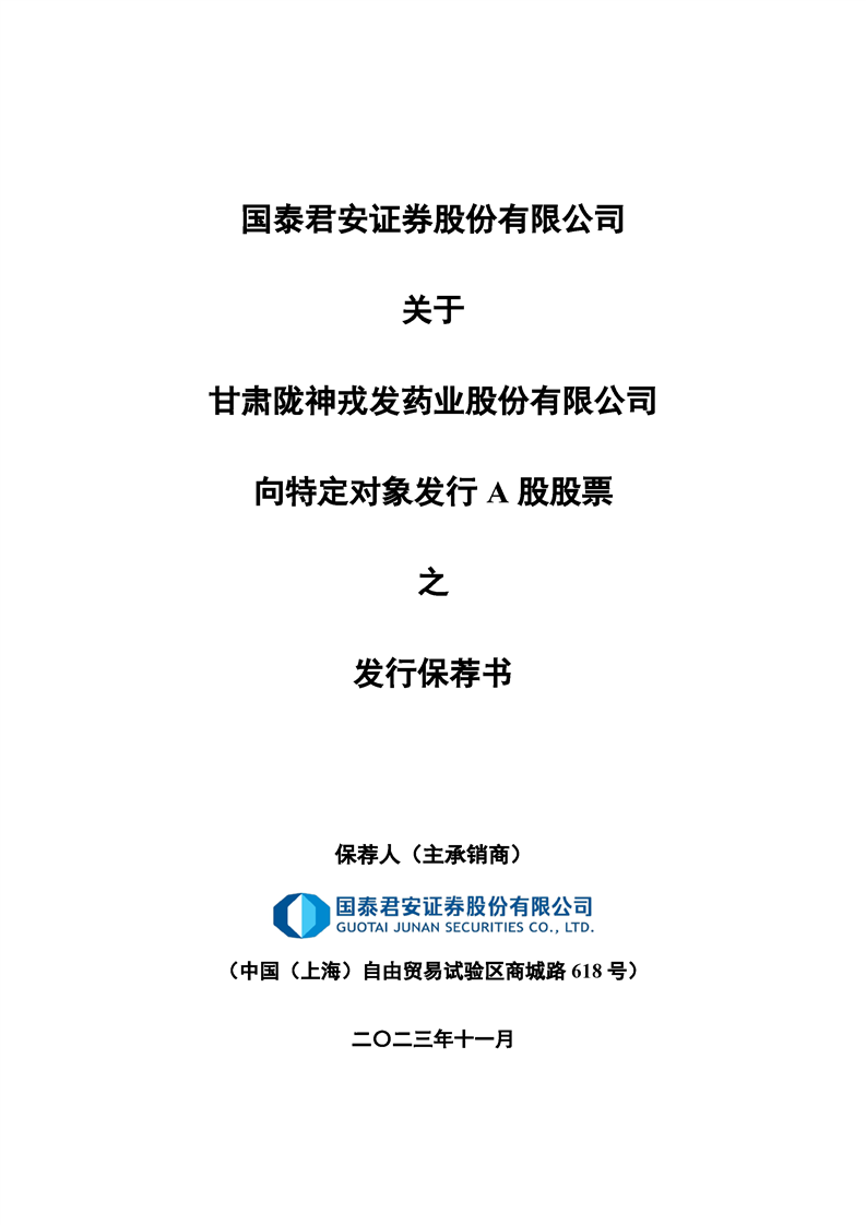 國泰君安證券股份有限公司關(guān)于甘肅隴神戎發(fā)藥業(yè)股份有限公司向特定對(duì)象發(fā)行A股股票之發(fā)行保薦書