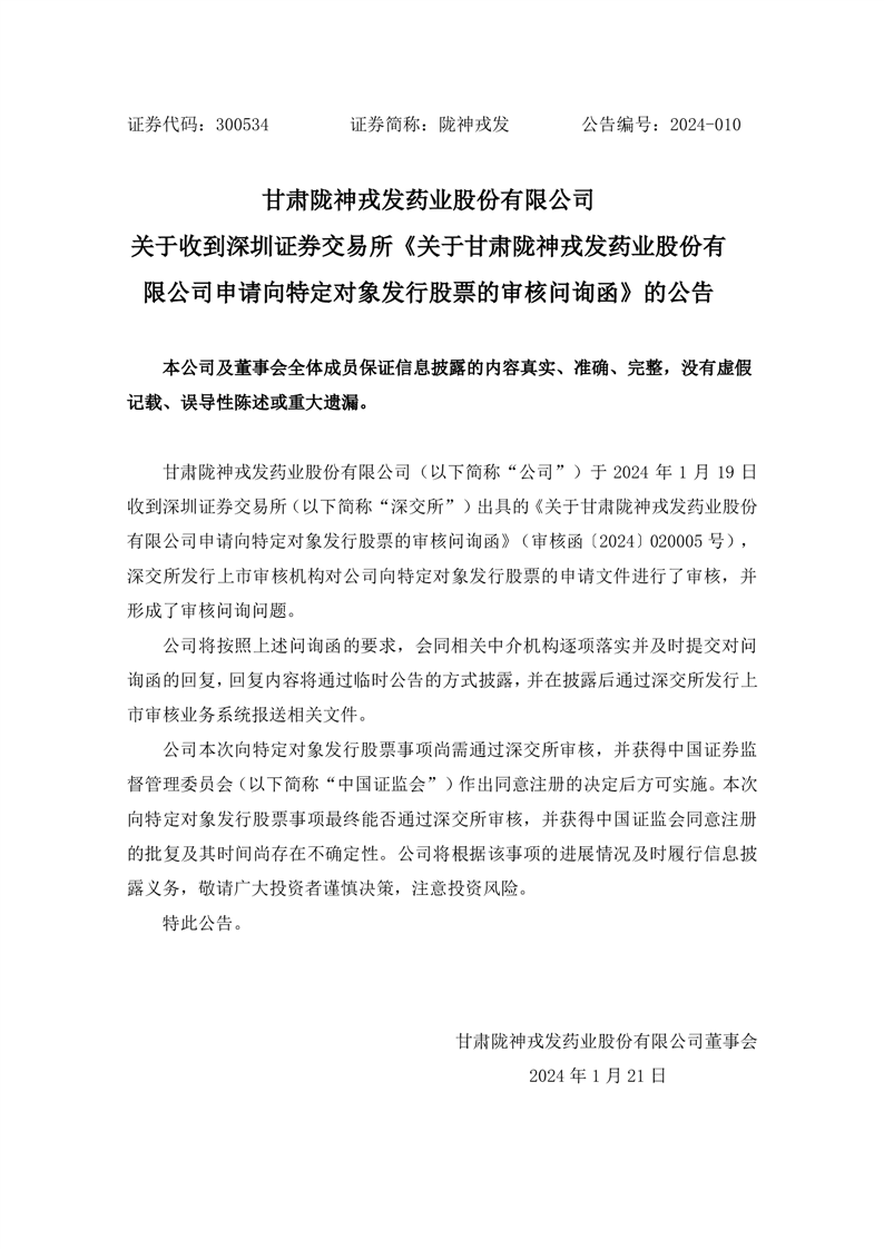 關(guān)于收到深圳證券交易所《關(guān)于甘肅隴神戎發(fā)藥業(yè)股份有限公司申請(qǐng)向特定對(duì)象發(fā)行股票的審核問(wèn)詢(xún)函》的公告