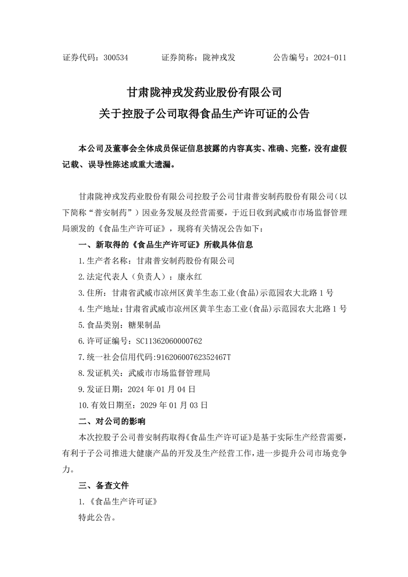 關(guān)于控股子公司取得食品生產(chǎn)許可證的公告