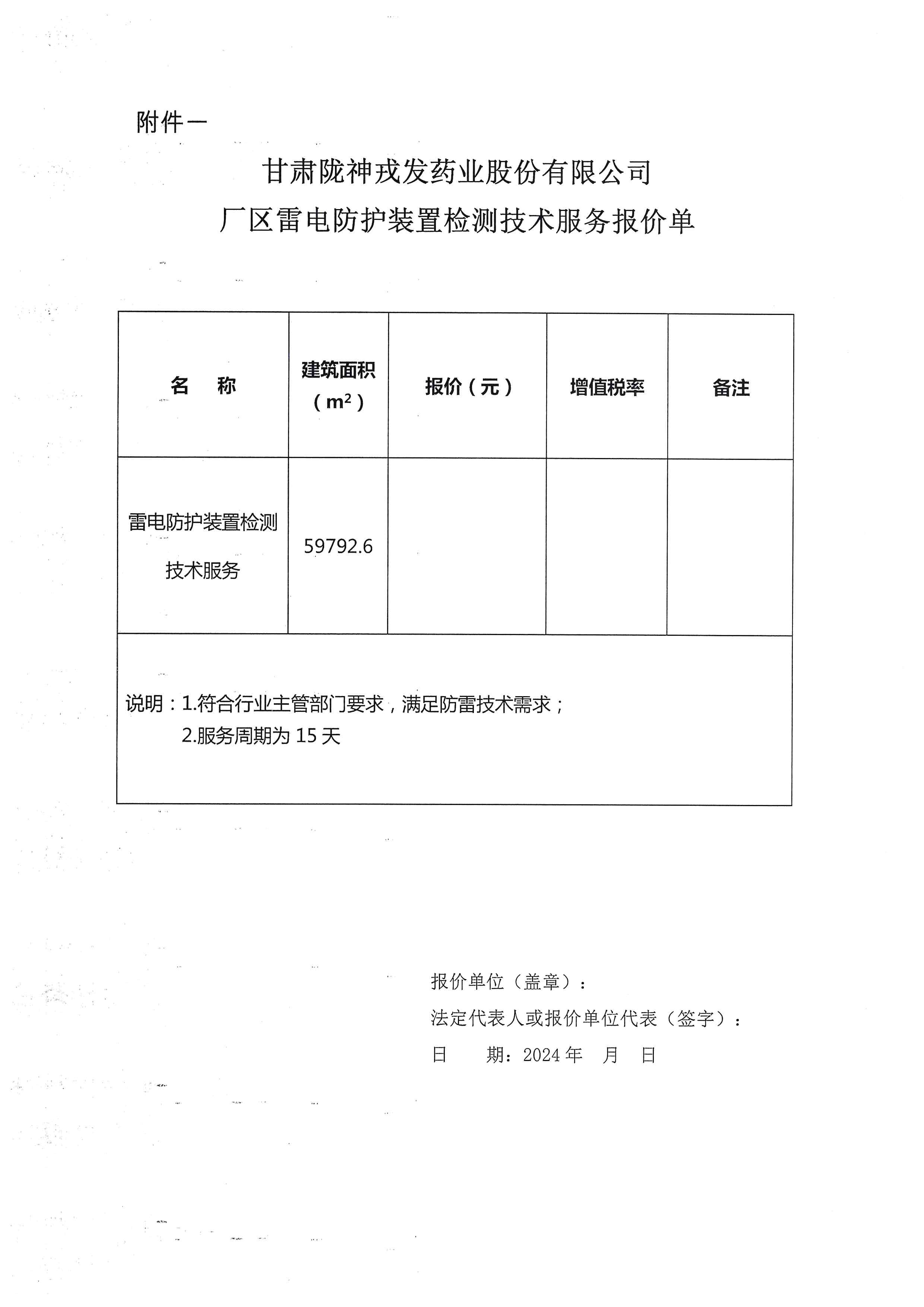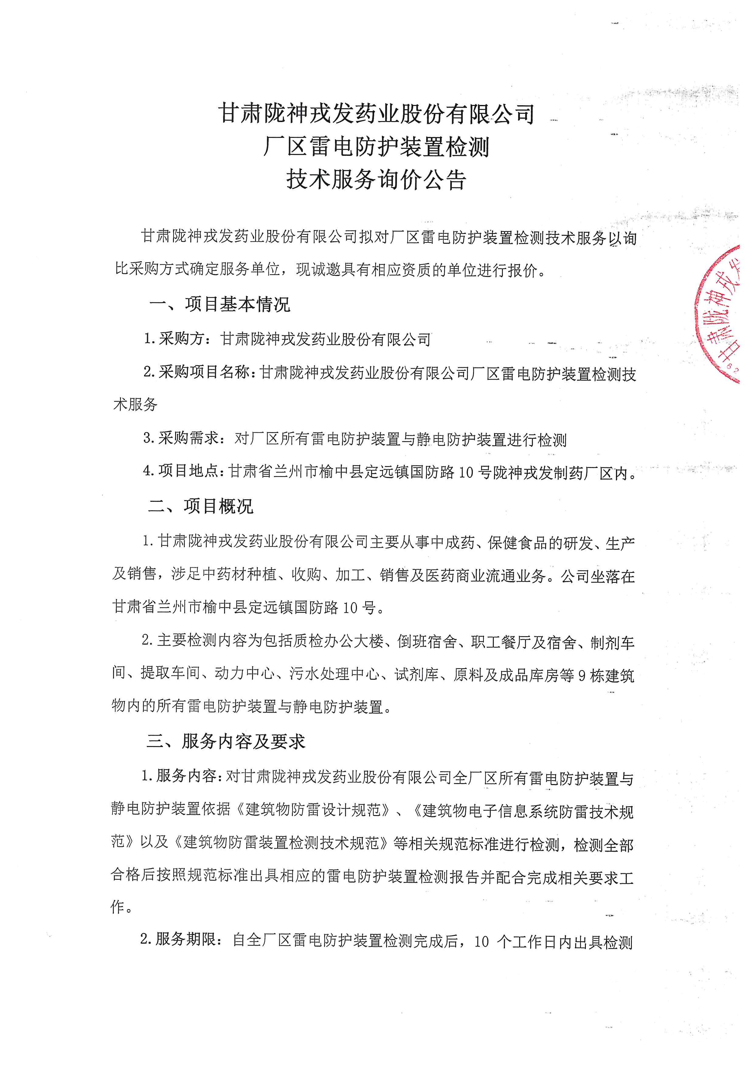 甘肅隴神戎發(fā)藥業(yè)股份有限公司廠區(qū)雷電防護裝置檢測技術(shù)服務(wù)詢價公告