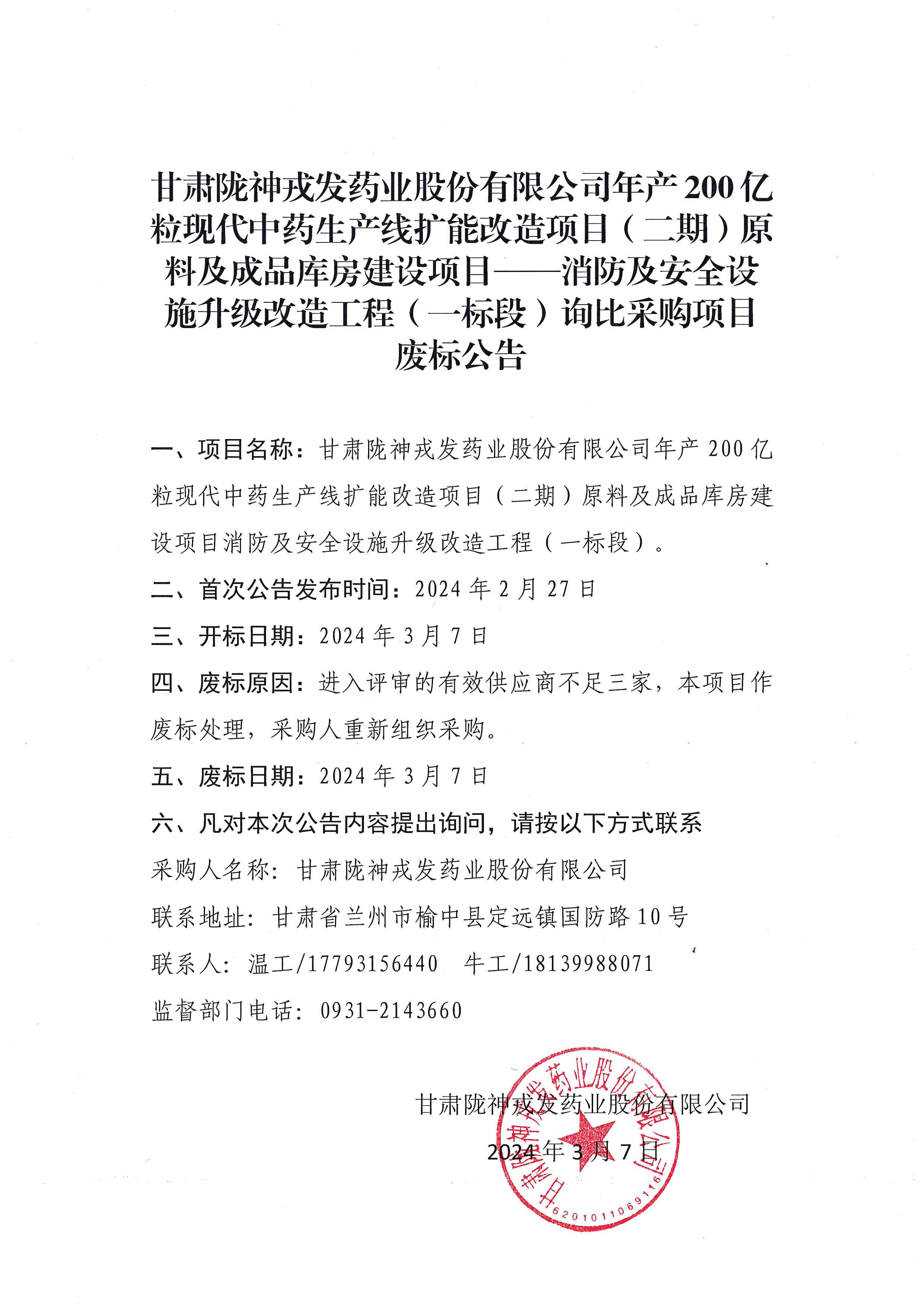 甘肅隴神戎發(fā)藥業(yè)股份有限公司年產(chǎn)200億粒現(xiàn)代中藥生產(chǎn)線擴(kuò)能改造項(xiàng)目(二期)原料及成品庫房建設(shè)項(xiàng)目--消防及安全設(shè)施升級(jí)改造工程(一標(biāo)段)詢比采購項(xiàng)目廢標(biāo)公告
