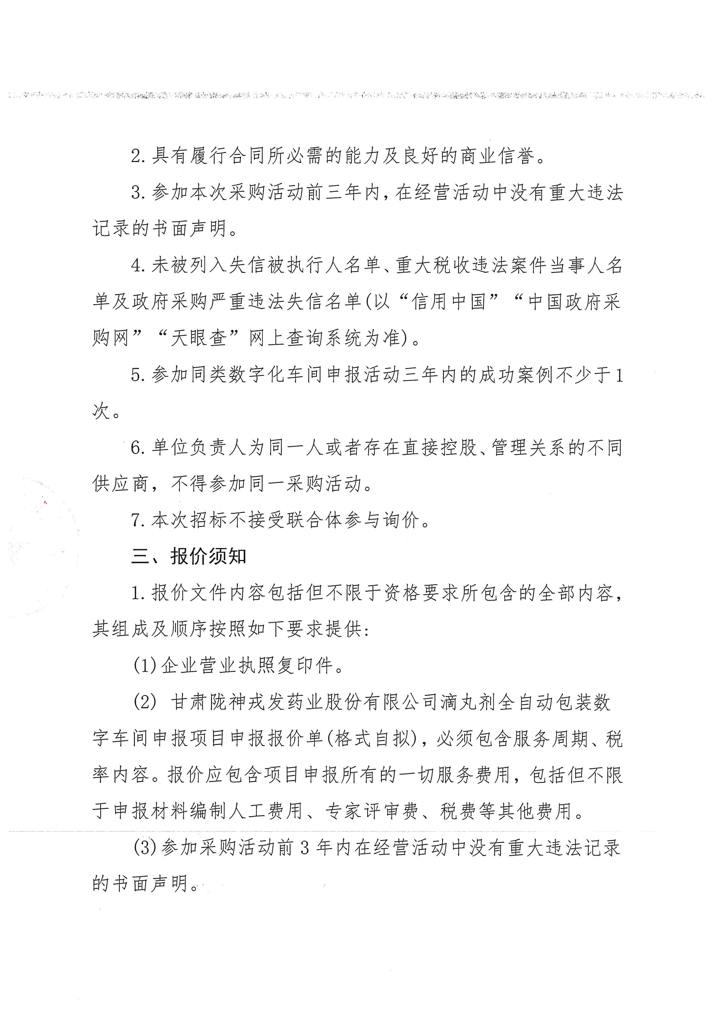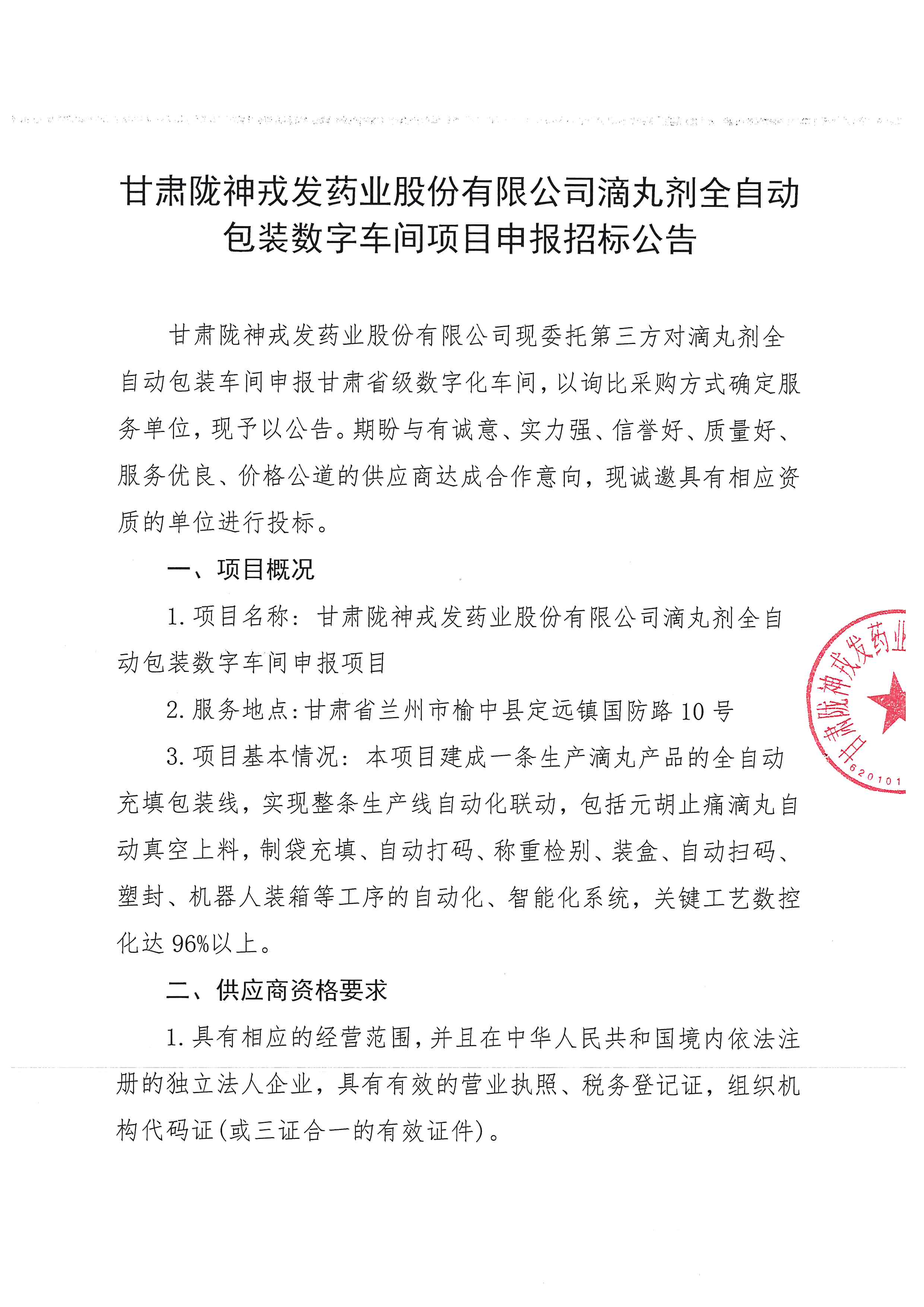 甘肅隴神戎發(fā)藥業(yè)股份有限公司滴丸劑全自動(dòng)包裝數(shù)字車間項(xiàng)目申報(bào)招標(biāo)公告