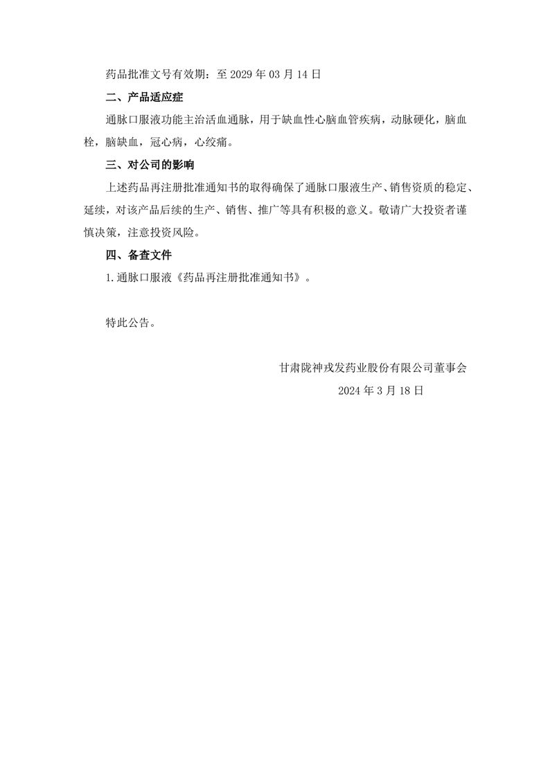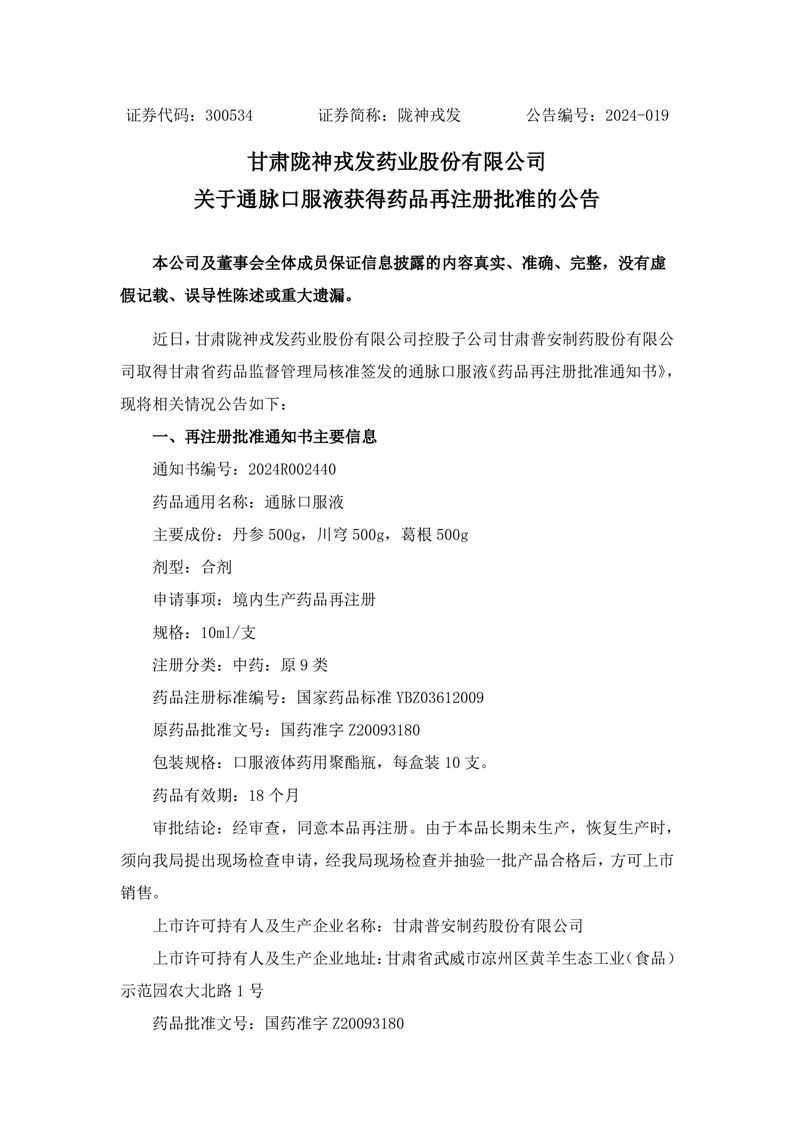 關(guān)于通脈口服液獲得藥品再注冊批準的公告