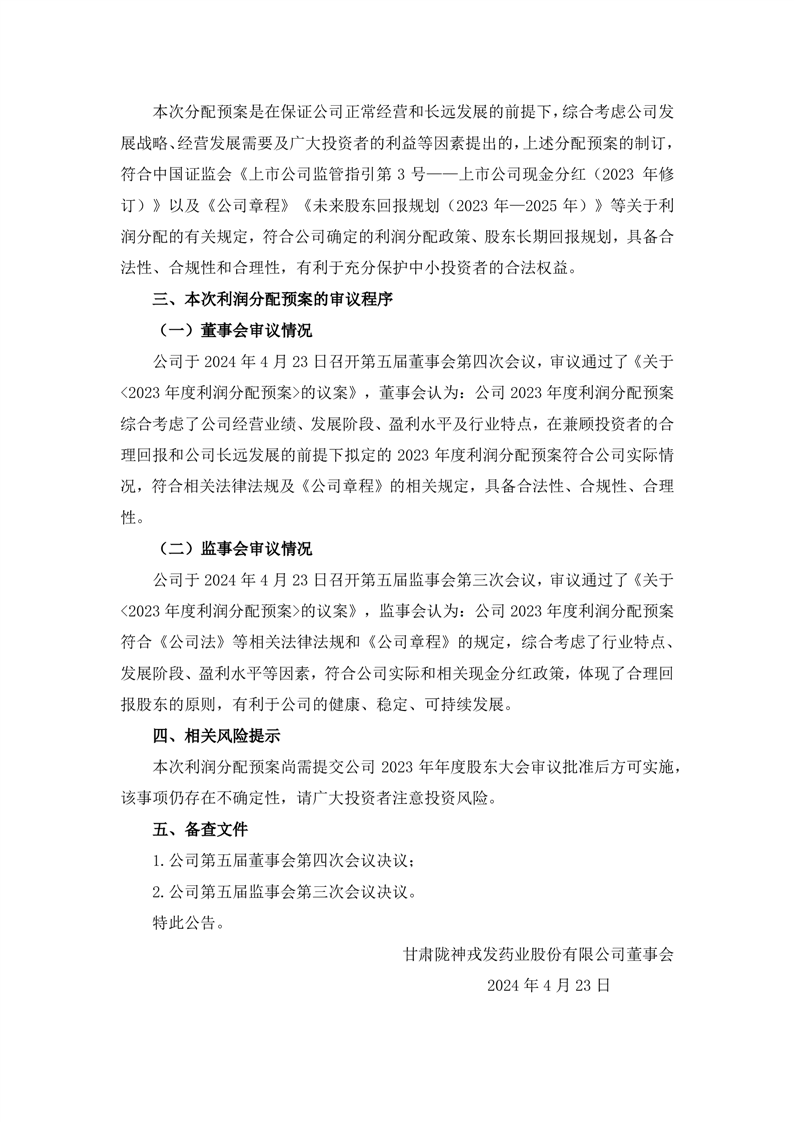 關(guān)于2023年度利潤分配預(yù)案的公告