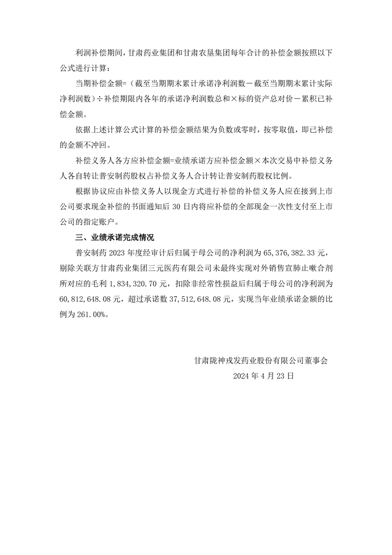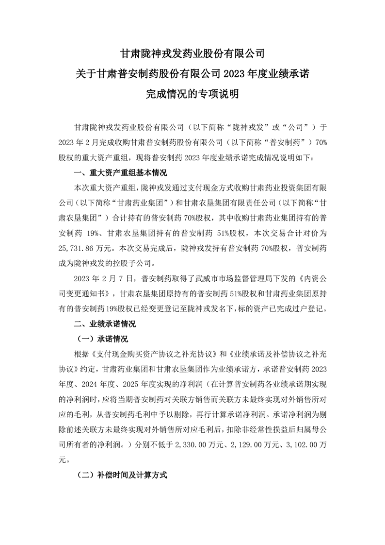 關(guān)于甘肅普安制藥股份有限公司2023年度業(yè)績承諾完成情況的專項(xiàng)說明