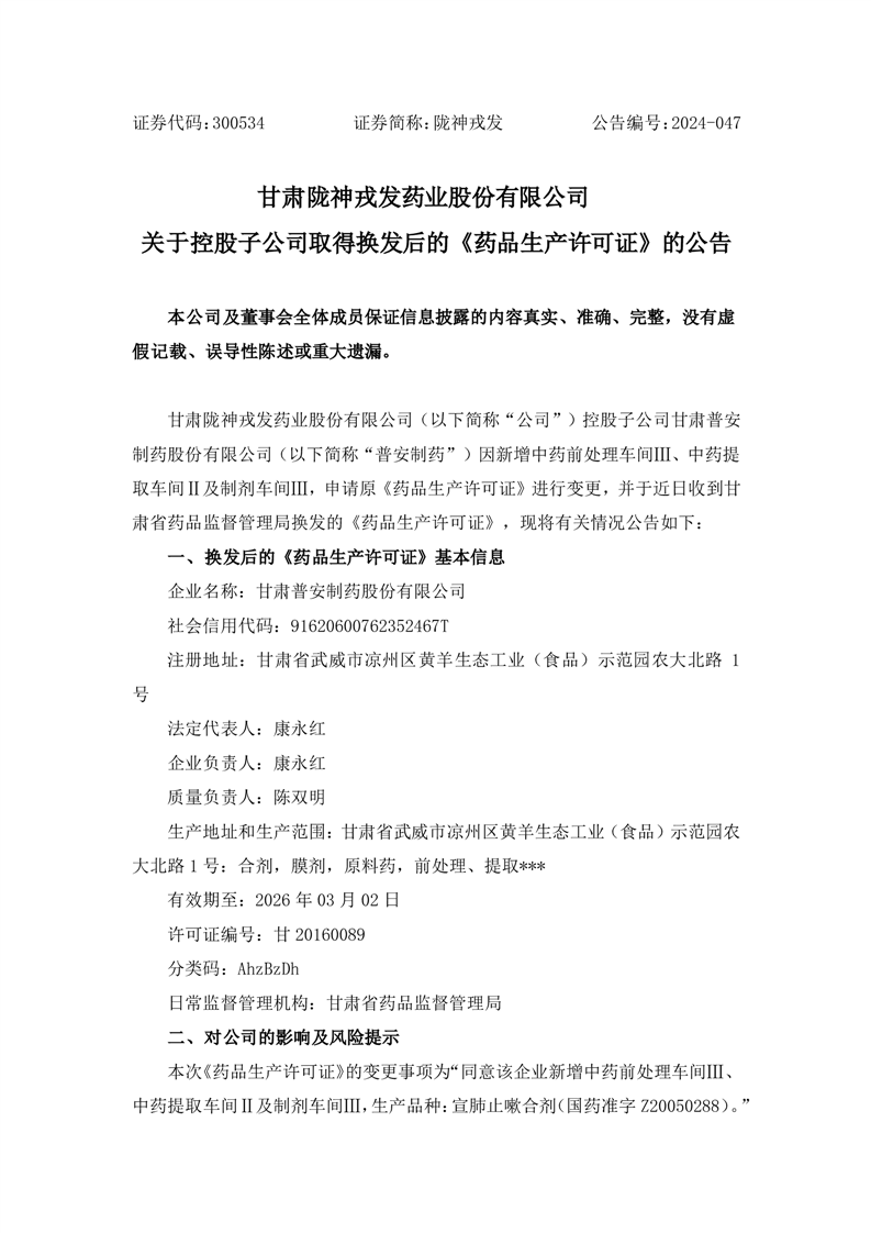 關(guān)于控股子公司取得換發(fā)后的《藥品生產(chǎn)許可證》的公告