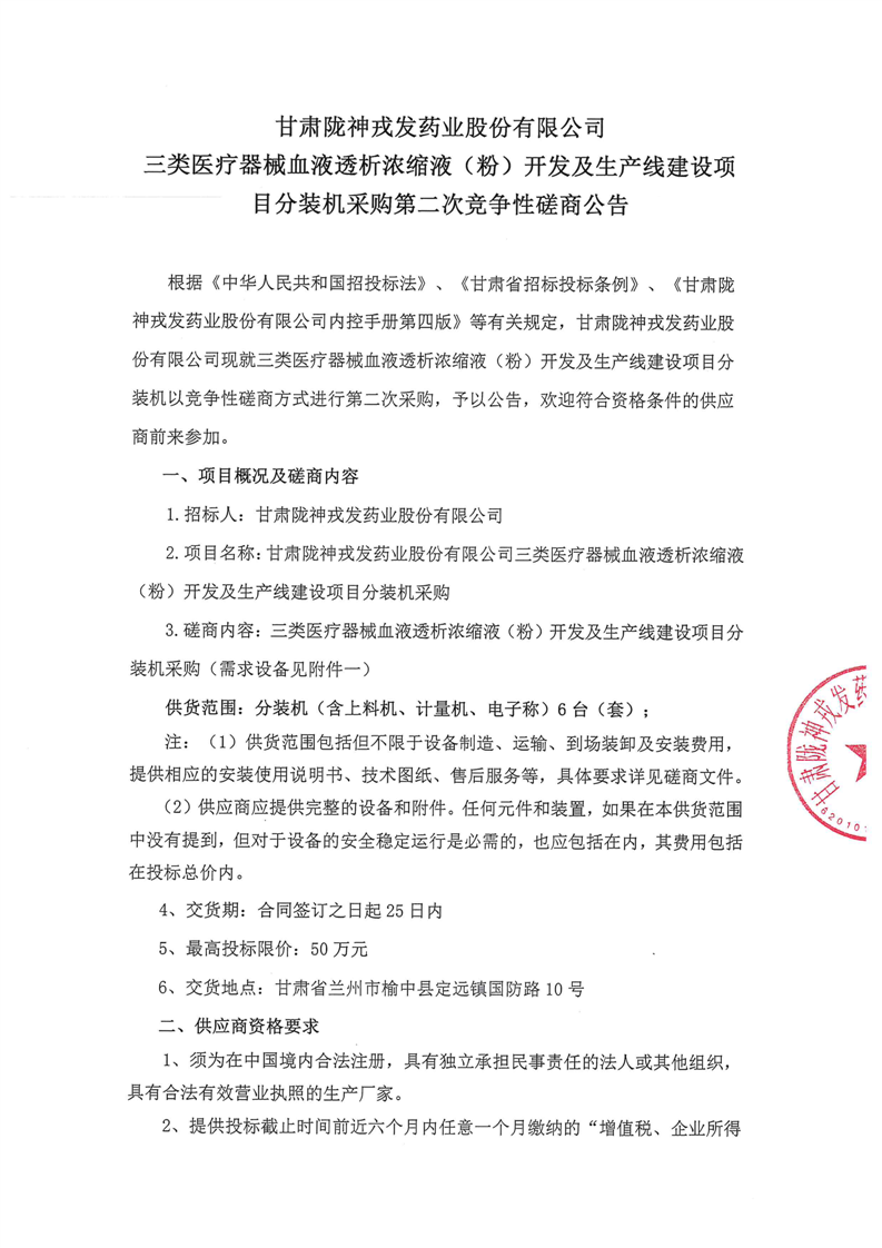 甘肅隴神戎發(fā)藥業(yè)股份有限公司三類醫(yī)療器械血液透析濃縮液(粉)開發(fā)及生產(chǎn)線建設(shè)項(xiàng)目分裝機(jī)采購第二次競爭性磋商公告