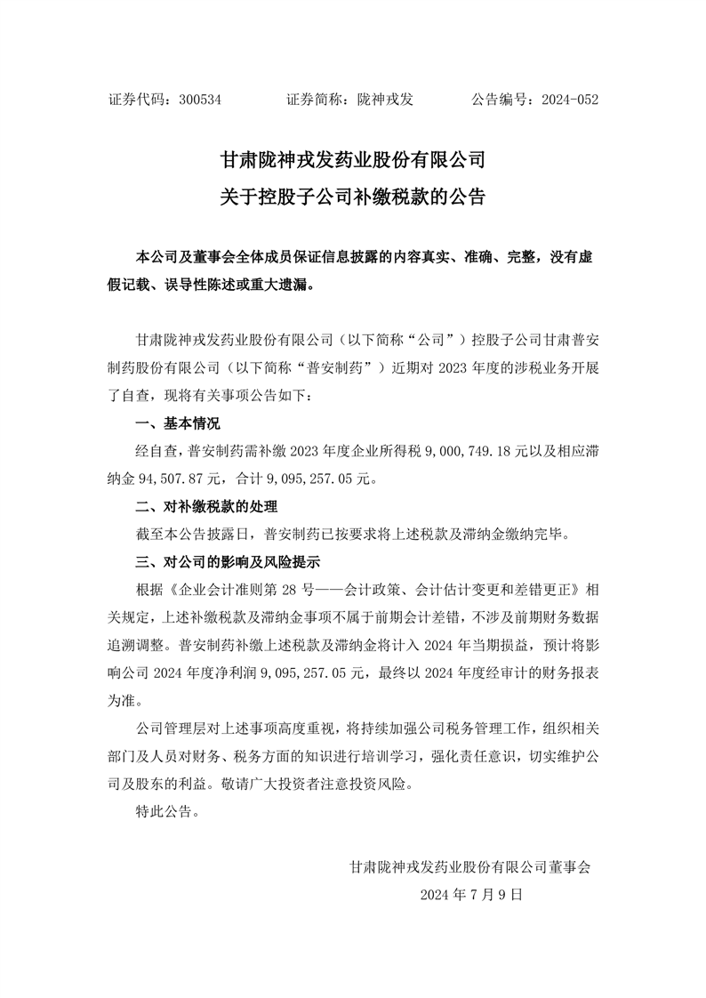 關(guān)于控股子公司補(bǔ)繳稅款的公告