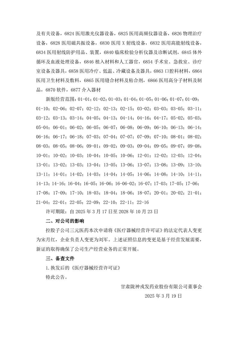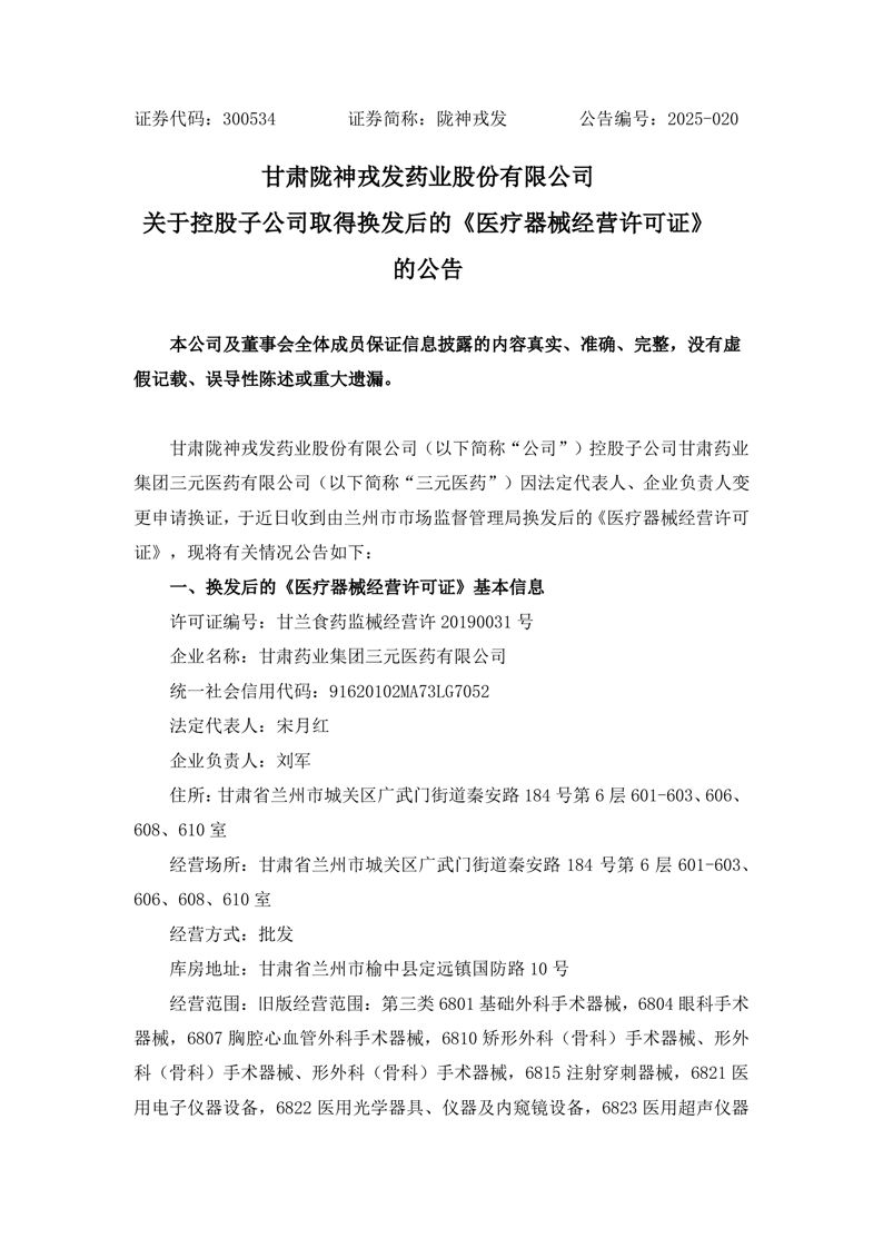 關(guān)于控股子公司取得換發(fā)后的《醫(yī)療器械經(jīng)營許可證》的公告