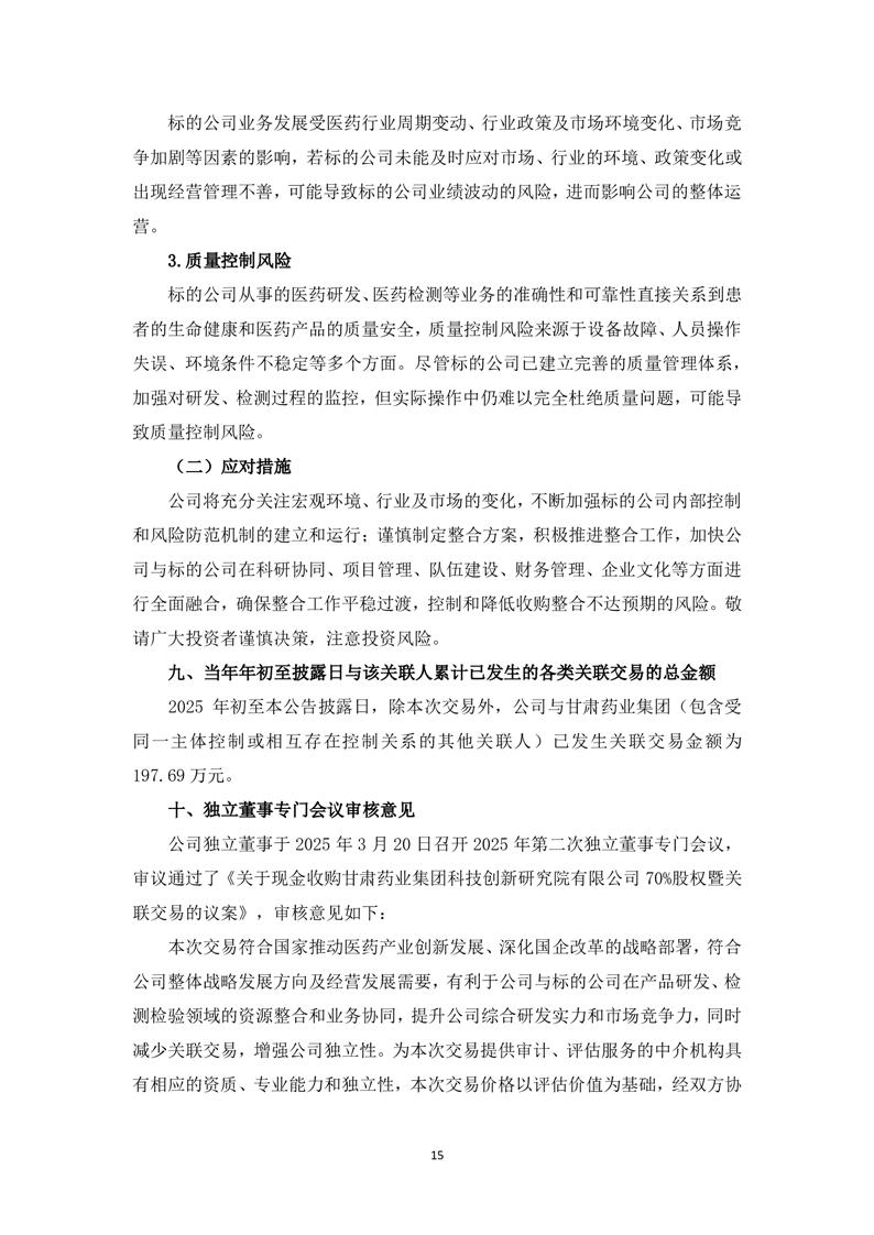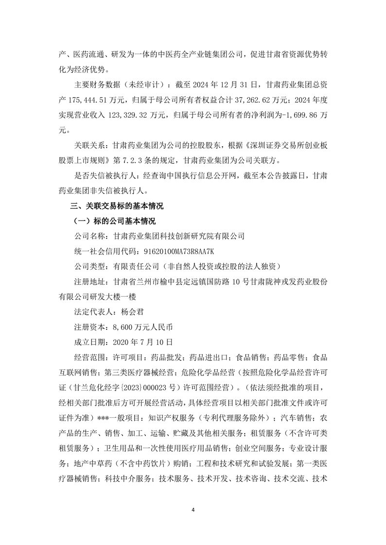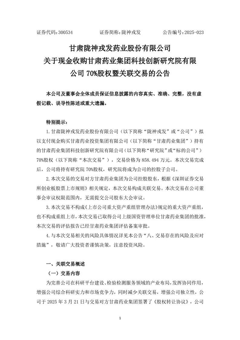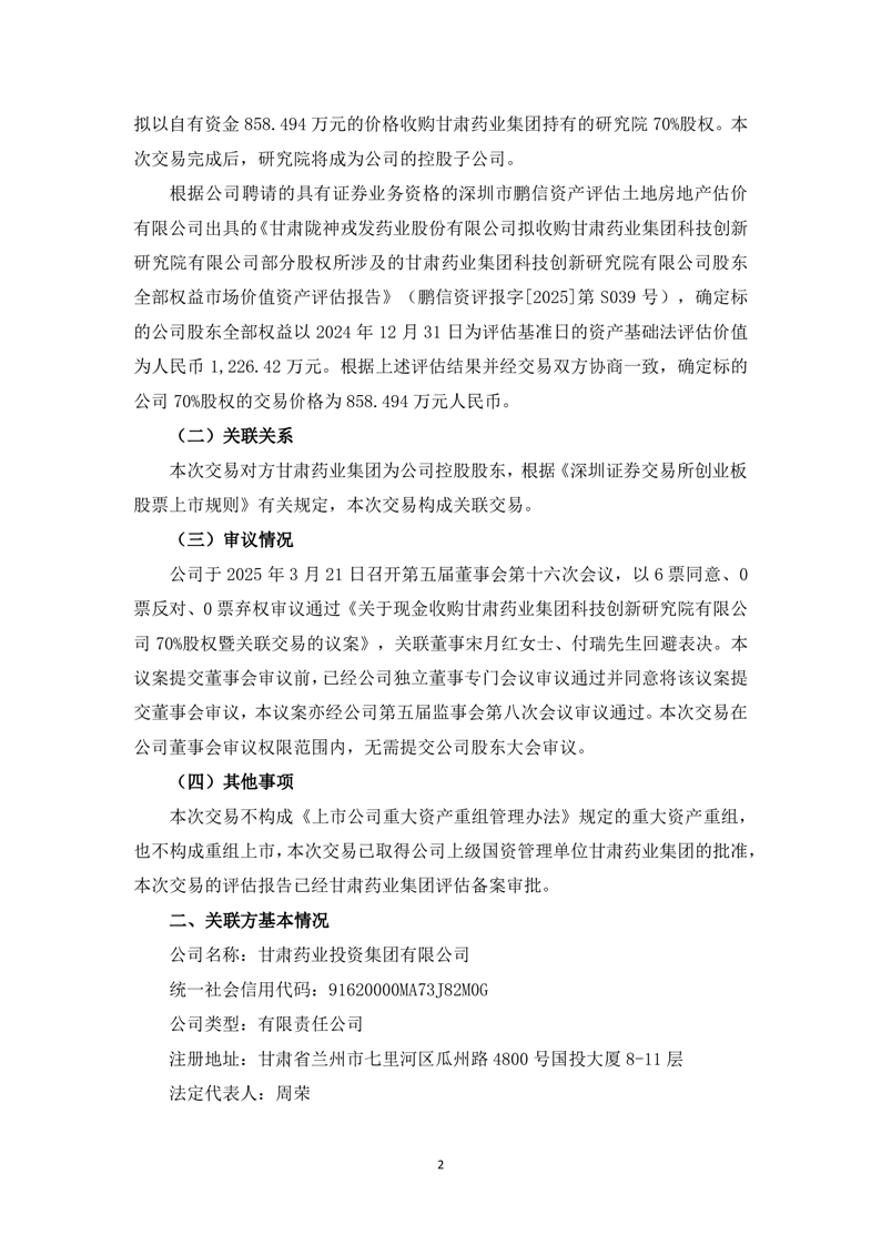 關(guān)于現(xiàn)金收購甘肅藥業(yè)集團科技創(chuàng)新研究院有限公司70%股權(quán)暨關(guān)聯(lián)交易的公告