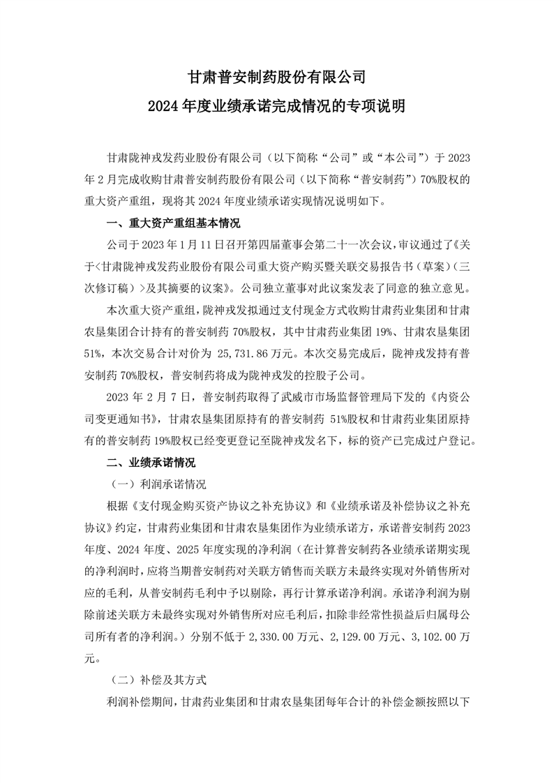 甘肅普安制藥股份有限公司2024年度業(yè)績承諾完成情況的專項說明